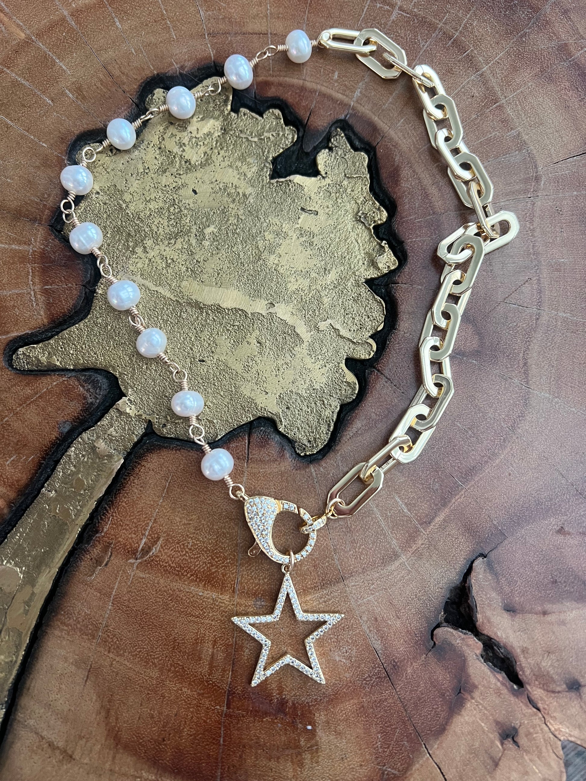 14K gold filled paperclip link necklace with freshwater pearls and pave CZ lobster claw clasp and star charm.