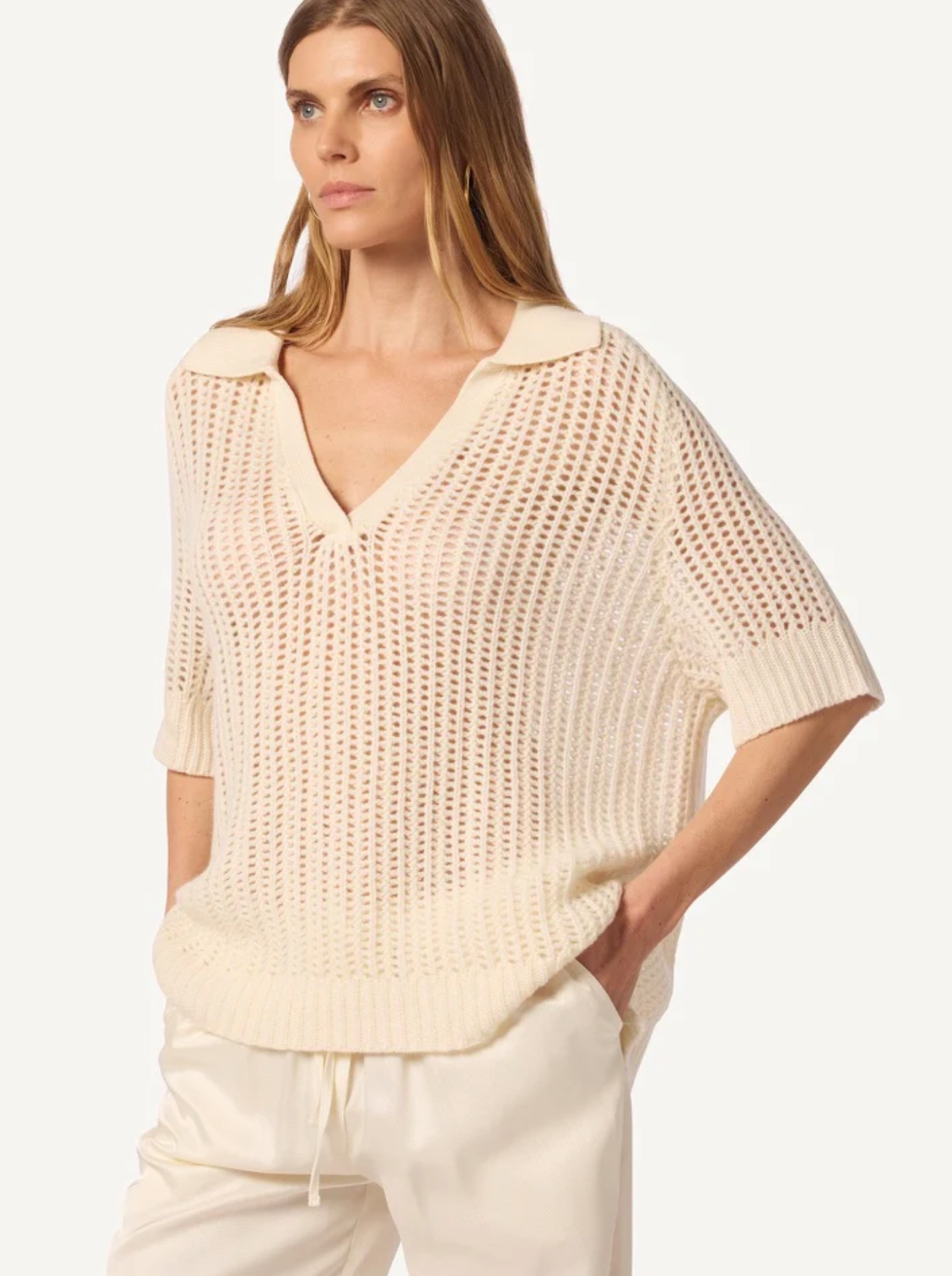 The Shalom Relaxed Split Neck Polo Longer Tee is crafted from 100% cashmere in an open-knit design, offering breathable luxury with a soft, textured finish. Its relaxed fit and split neckline create a polished yet laid-back look, perfect for layering or wearing solo. The extended length and classic polo-inspired collar add versatility, making this piece a staple for both casual and elevated styling.