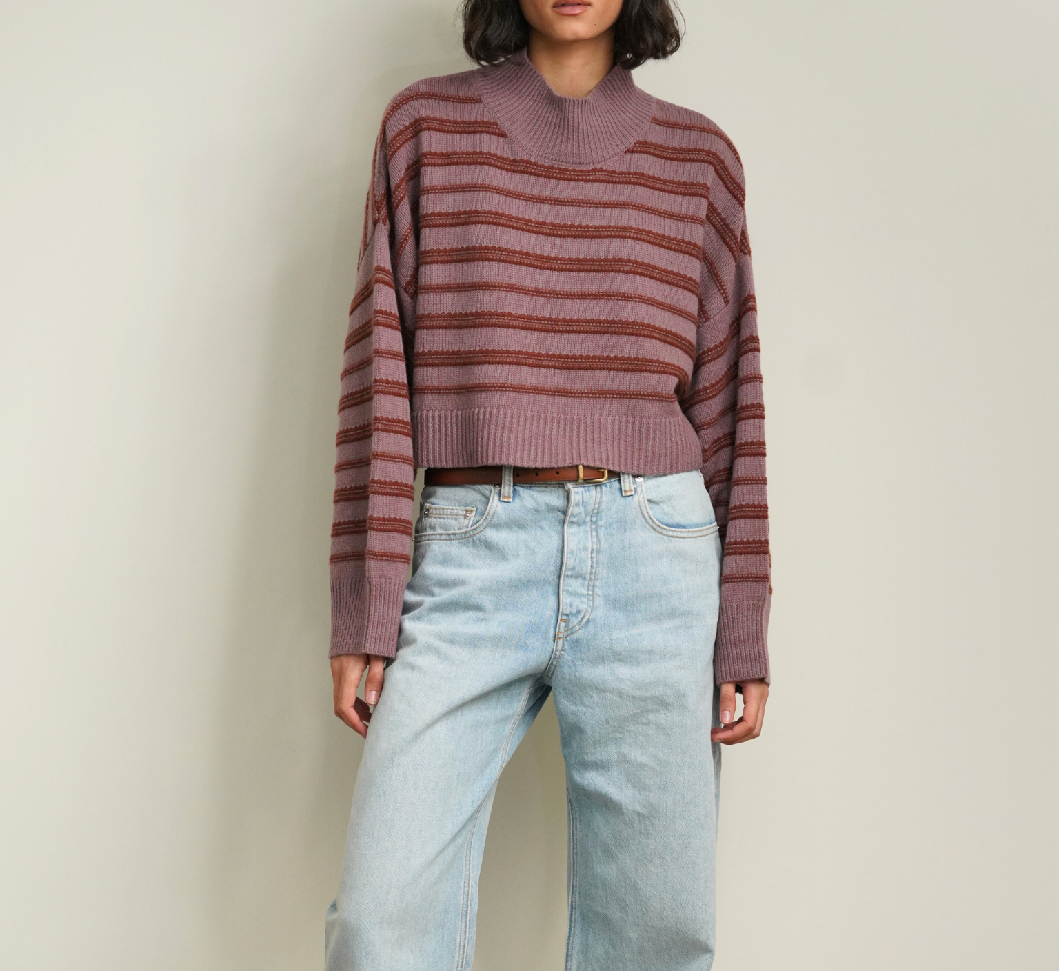 Cropped mockneck sweater in stripe by Sablyn.
