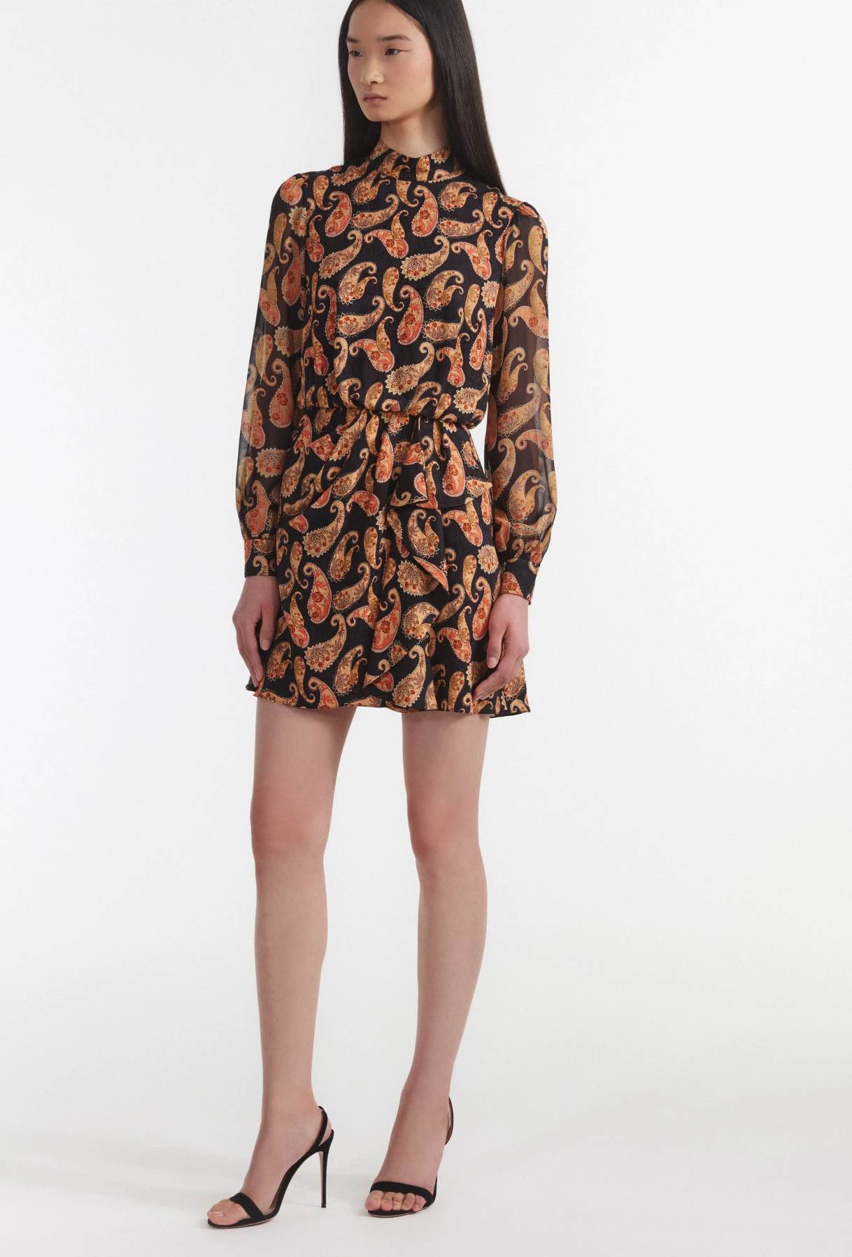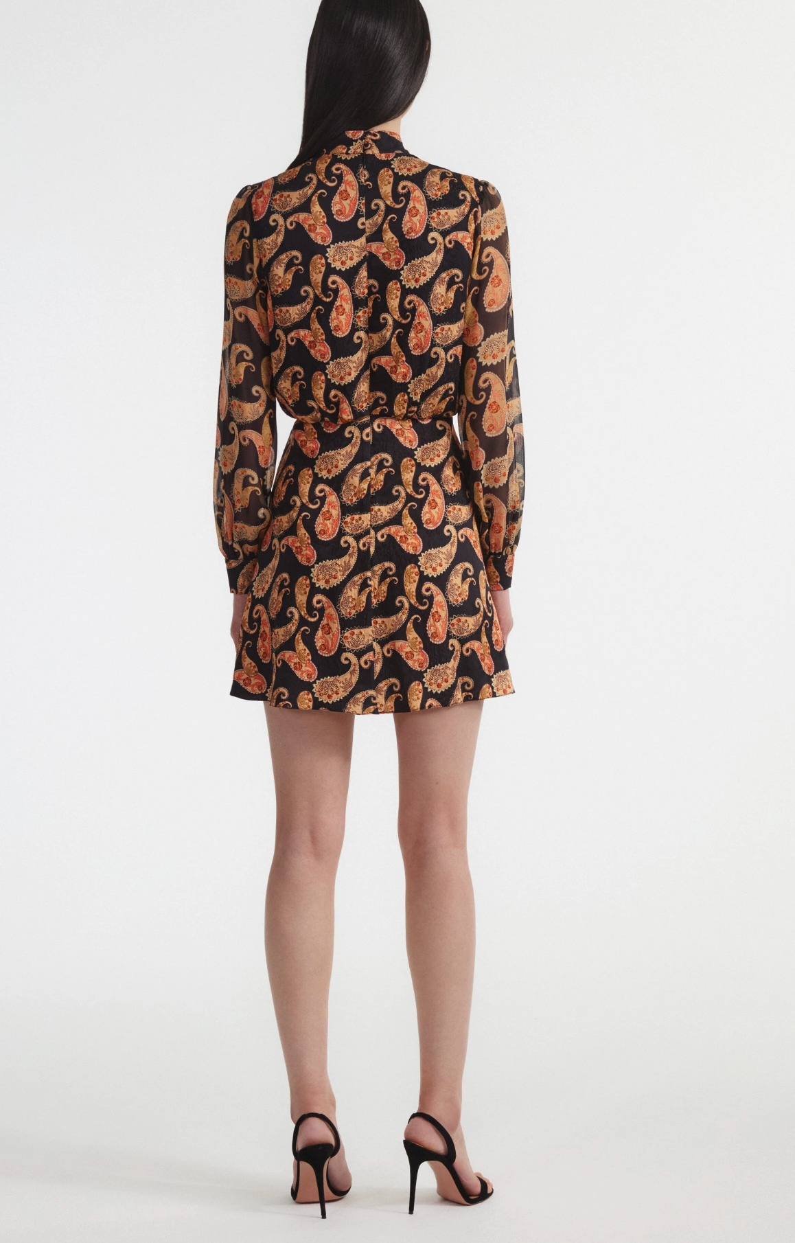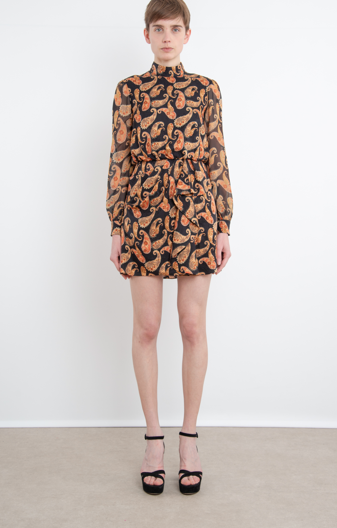 The Draped Isa Short Dress in Ixora Cashew is a captivating update for the season. This silk dress, featuring Ixora Cashew print with hand-painted tonal paisleys tessellate over the black ground. With a blouson bodice, gently puffed long sleeves, and a draped short skirt this dress is both elegant and playful.
