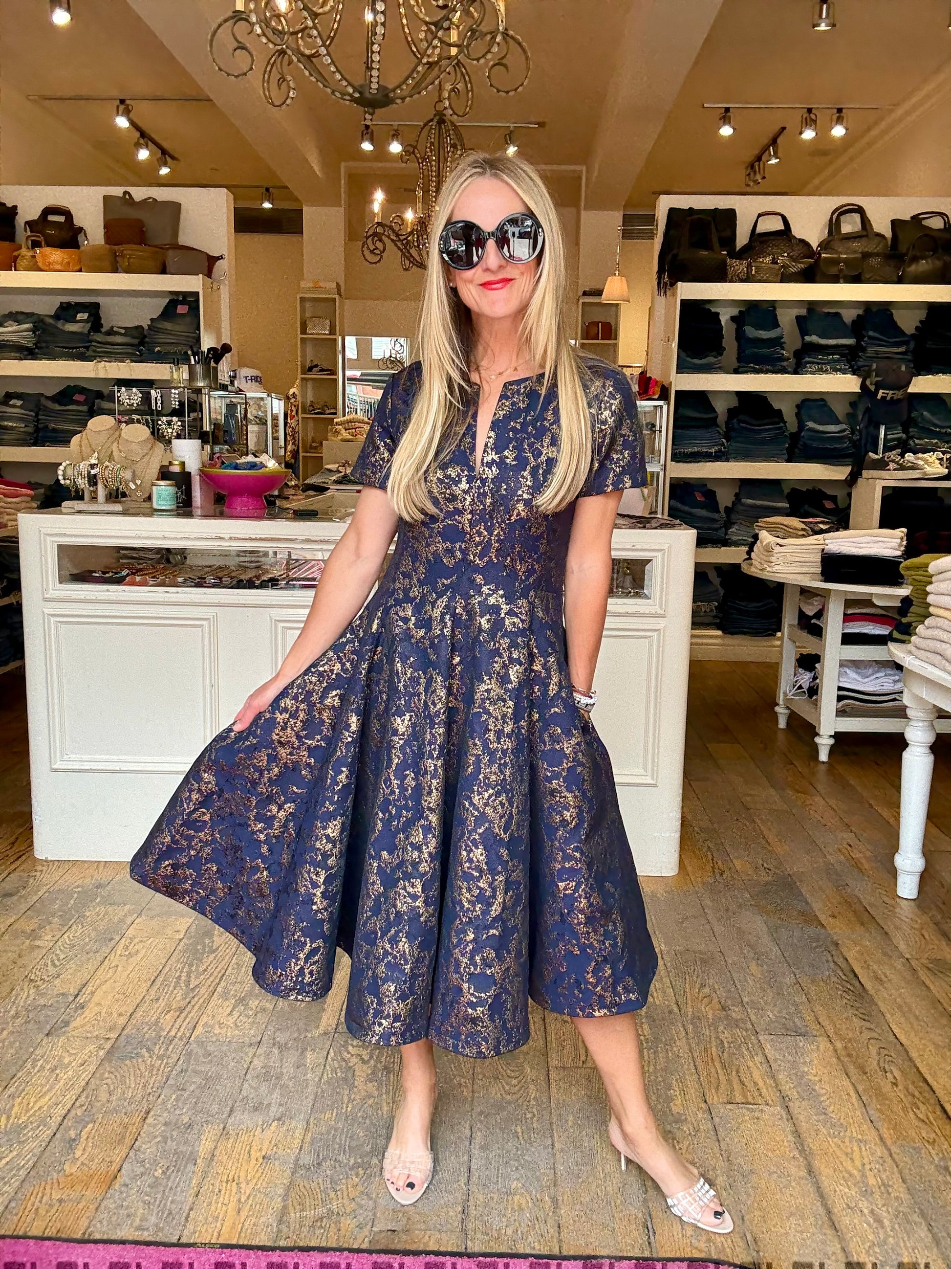 Brocade navy and gold dress with vneck, zip back closure, full below knee skirt. Embellished belt sold separately.