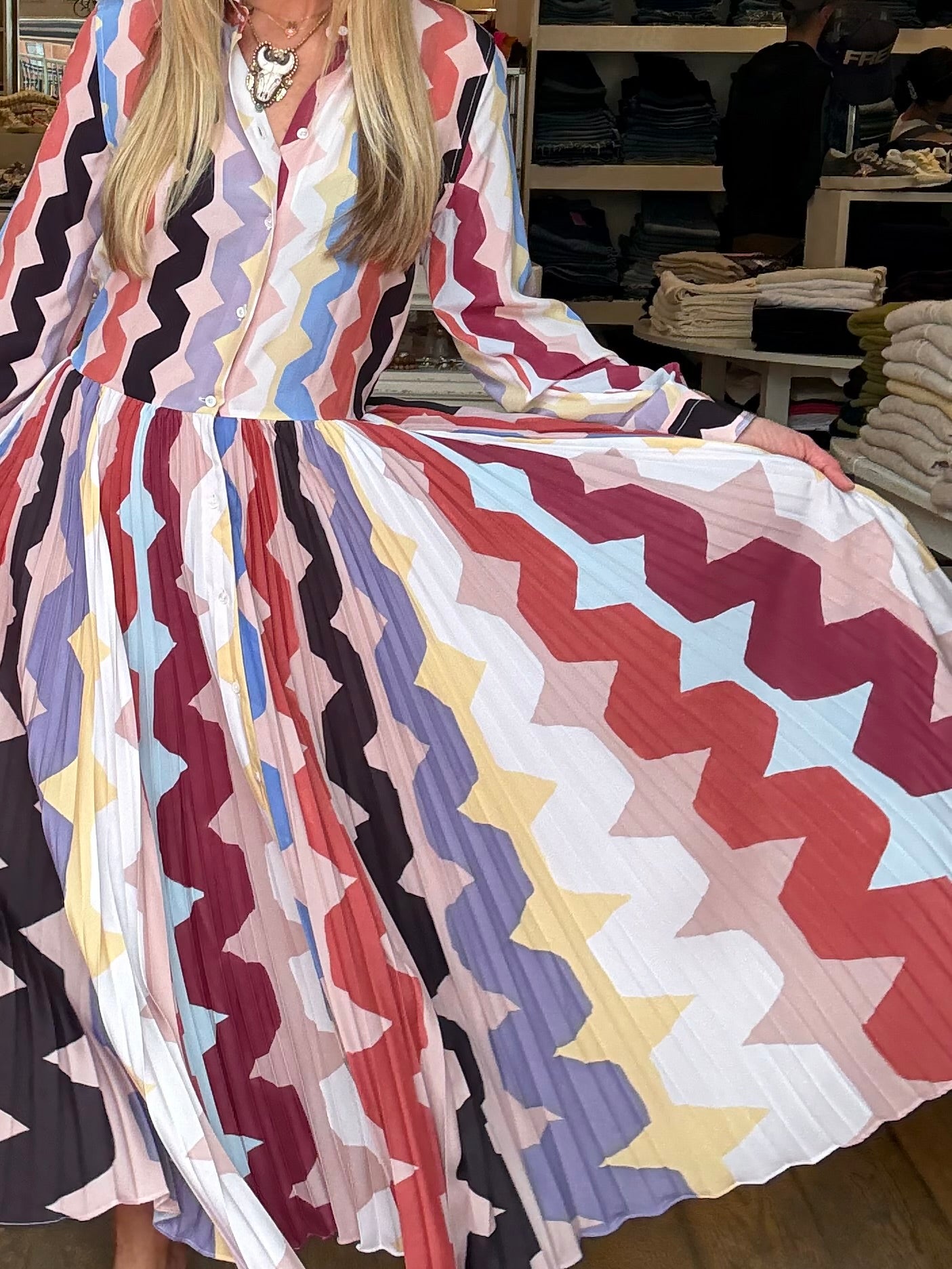 Silk button down shirt dress with micro pleated bottom. Belt sold separately. Add Sara Roka belt in grosgrain ribbon in brick.