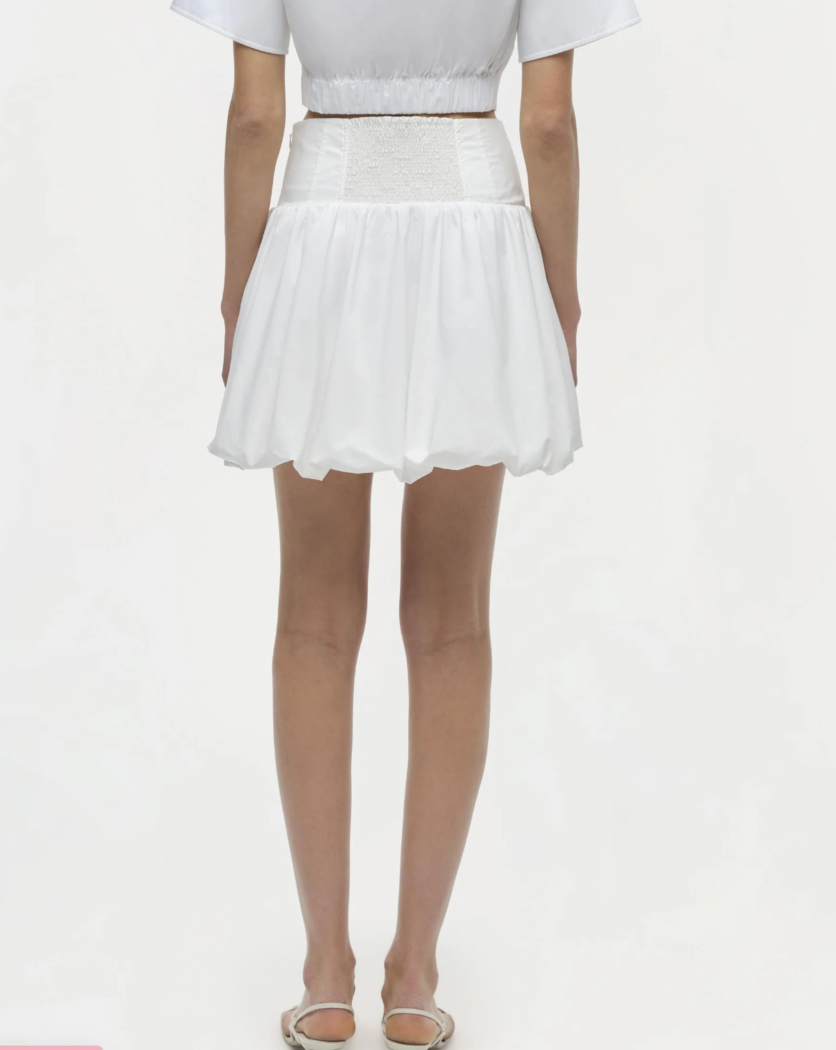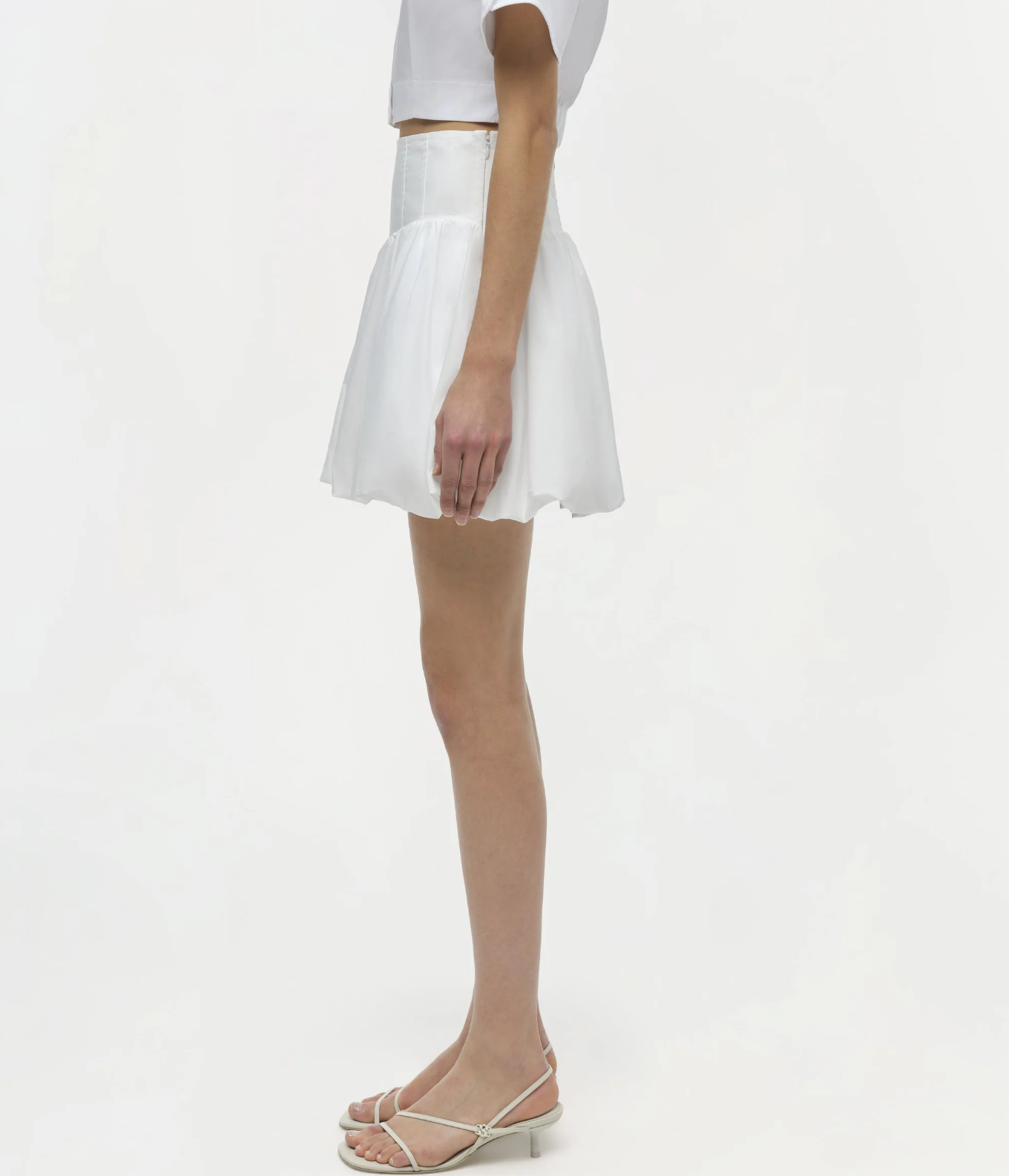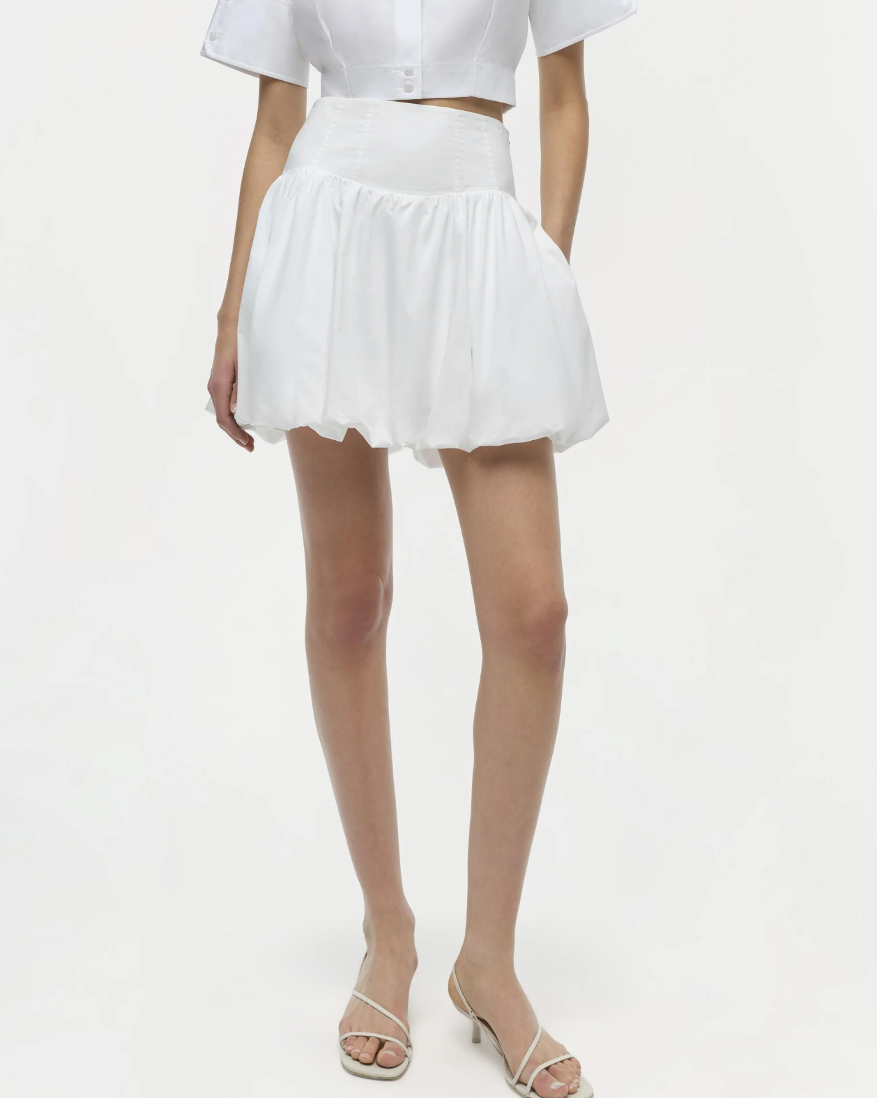 The Pippa Cotton Mini Skirt in White. Crafted from crisp cotton poplin, this playful bubble mini showcases a voluminous silhouette and structured design.