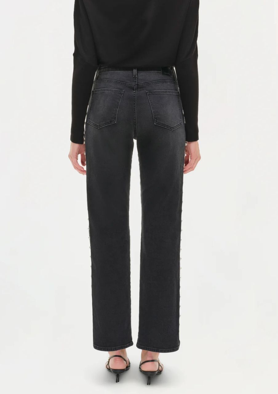 A straight leg jean in the classic 5 pocket construction with pearl embellishments down the side.