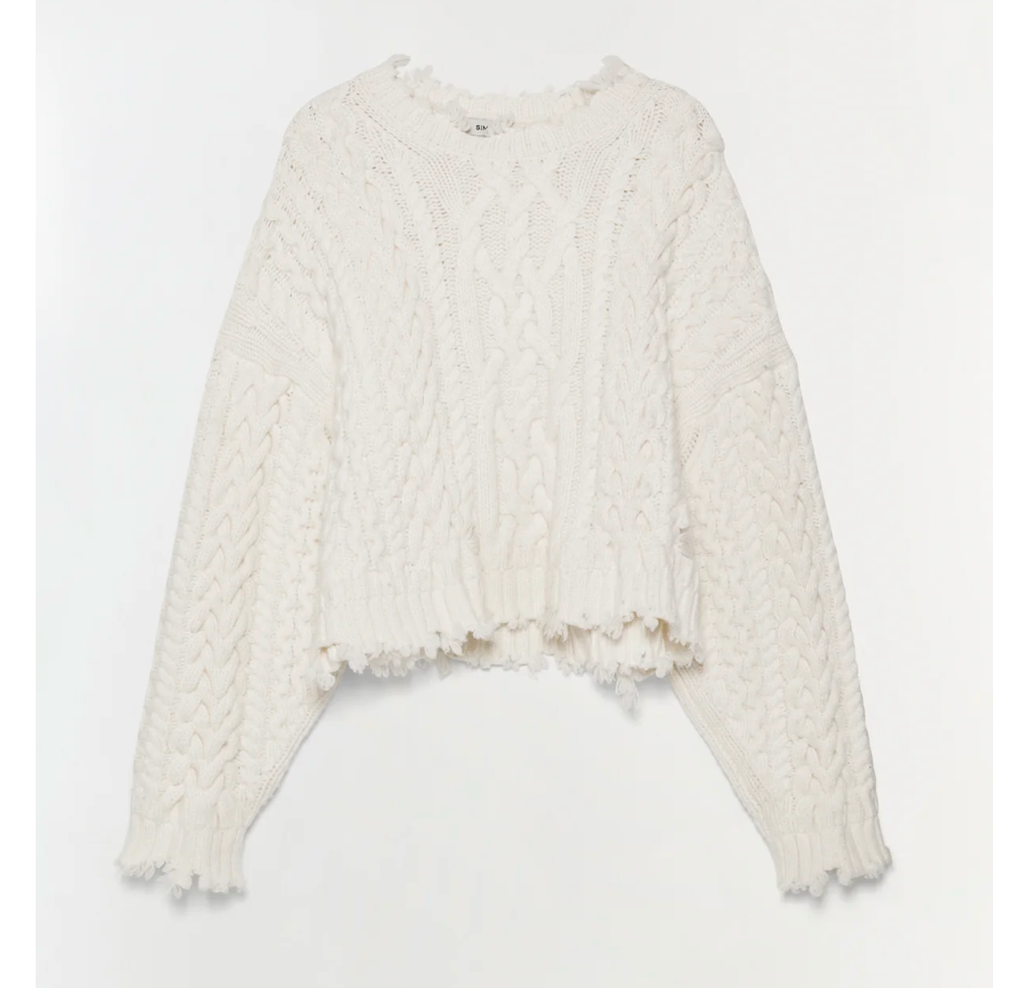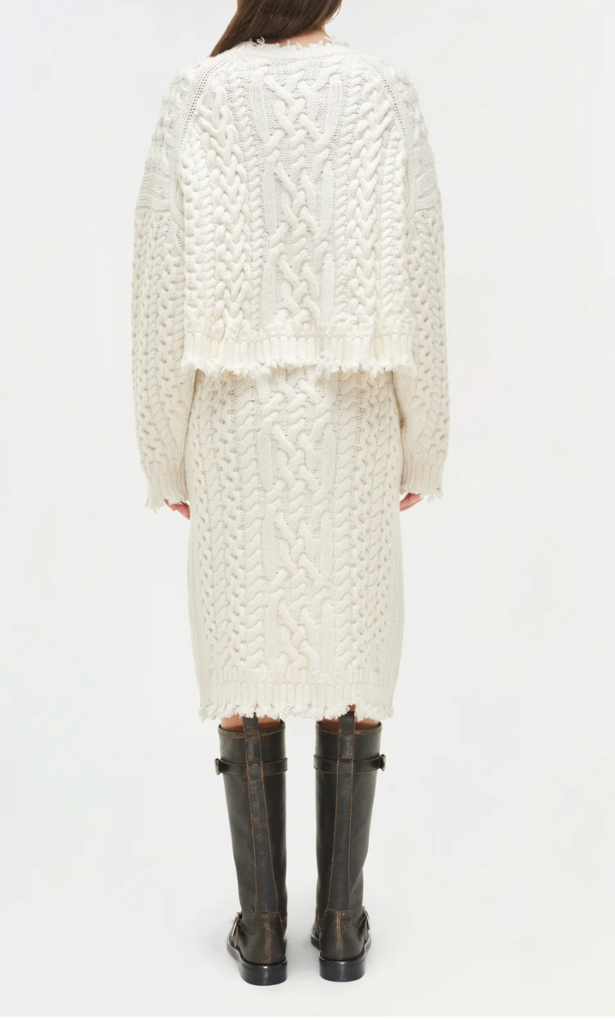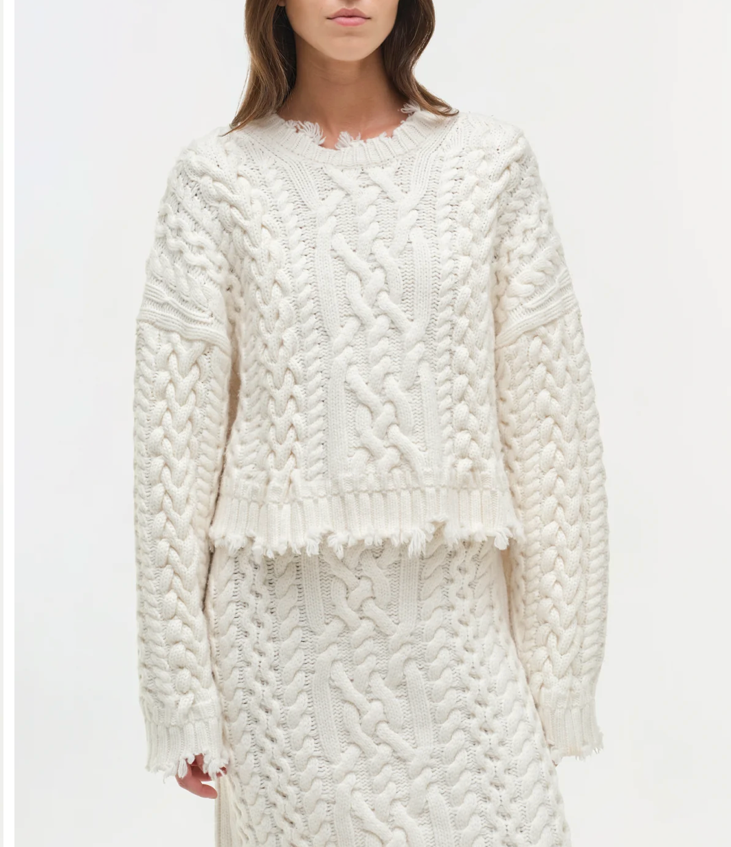 The Felix Knit Cropped Sweater in ivory. A chunky cable knit sweater in a cropped cut with distressed hem. Pair with matching Simkhai Brioni Skirt.