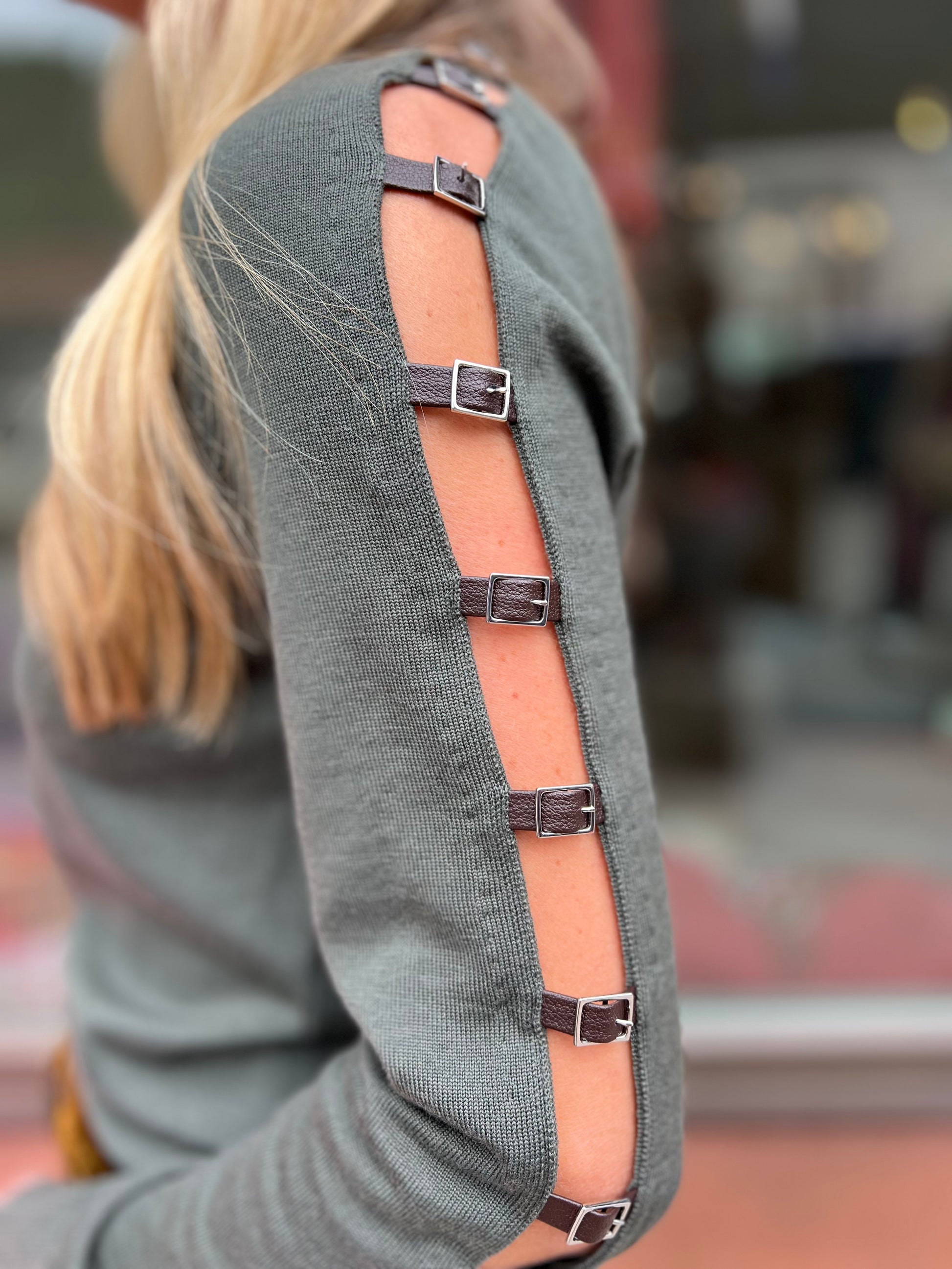 This long sleeve piece features a classic crew neckline and a slim, tailored fit. Its mini buckles design down the sleeves makes it a unique addition to any wardrobe.