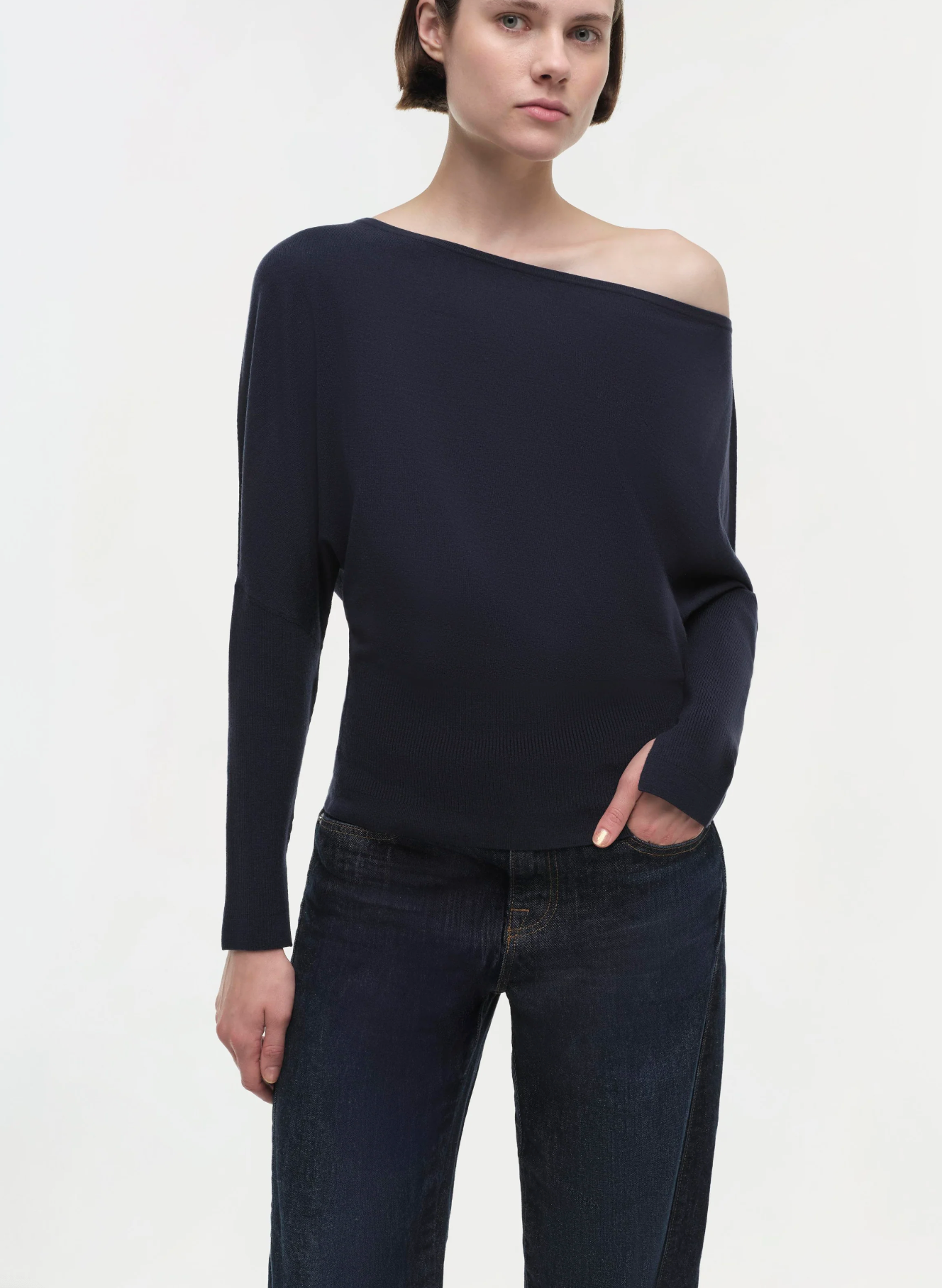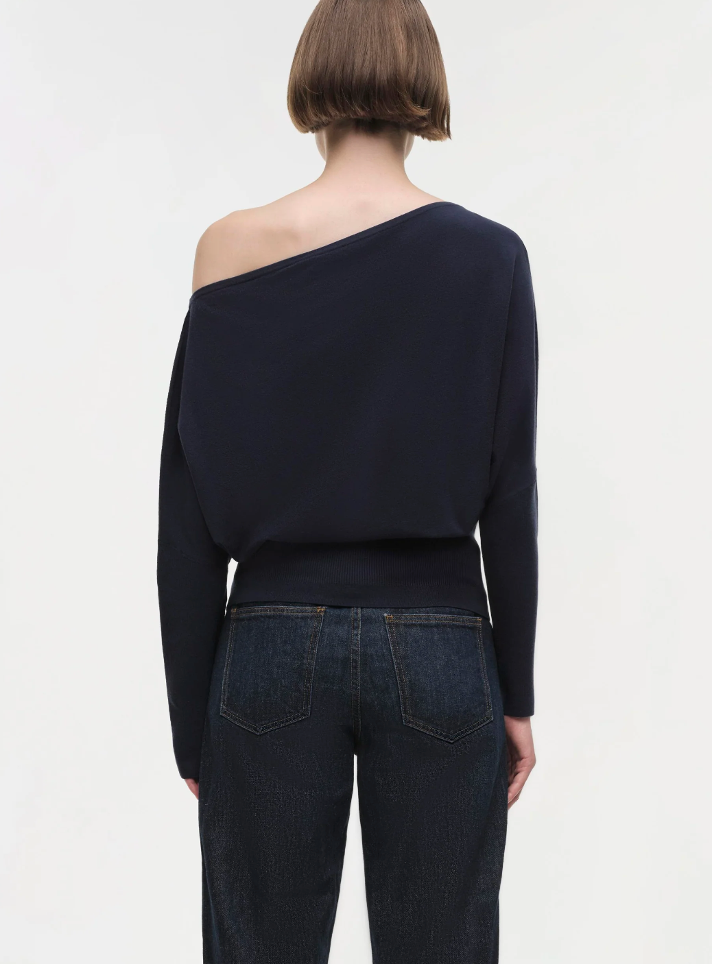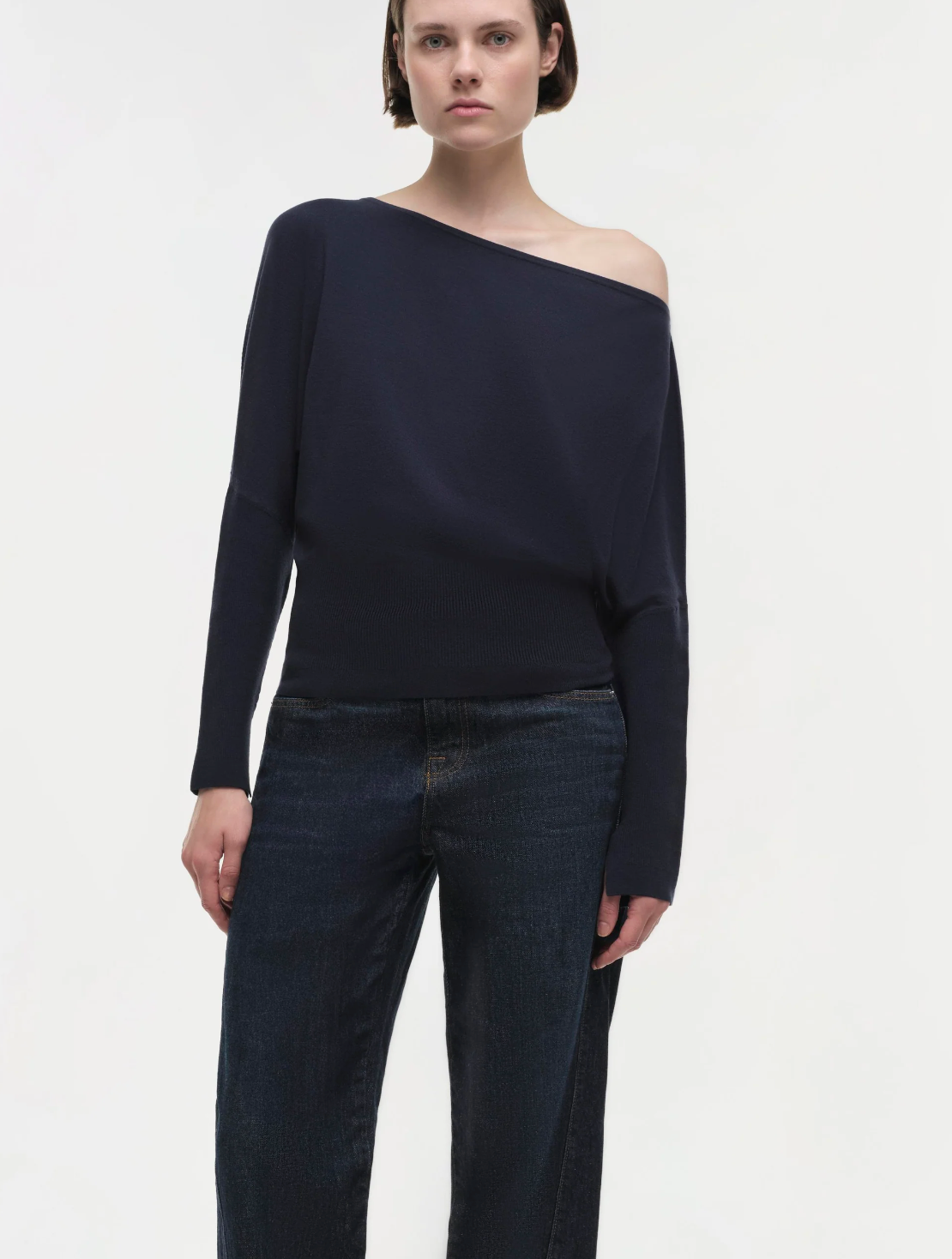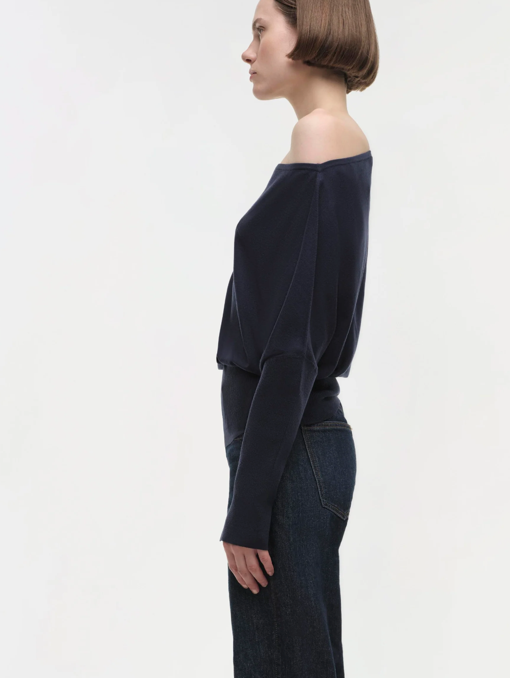 The Lavina Sweater in Midnight. This draped off-shoulder top features an elegant asymmetric neckline and a relaxed fit. Its sophisticated design adds a touch of modern style to any wardrobe.
