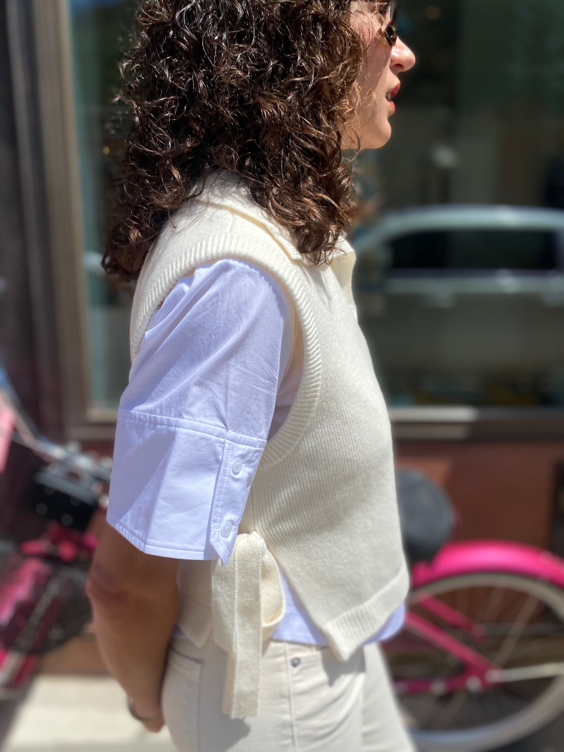 SIMKHAI's Leanna mix media top showcases poplin striped cotton sleeves and hem and a merino wool bodice.