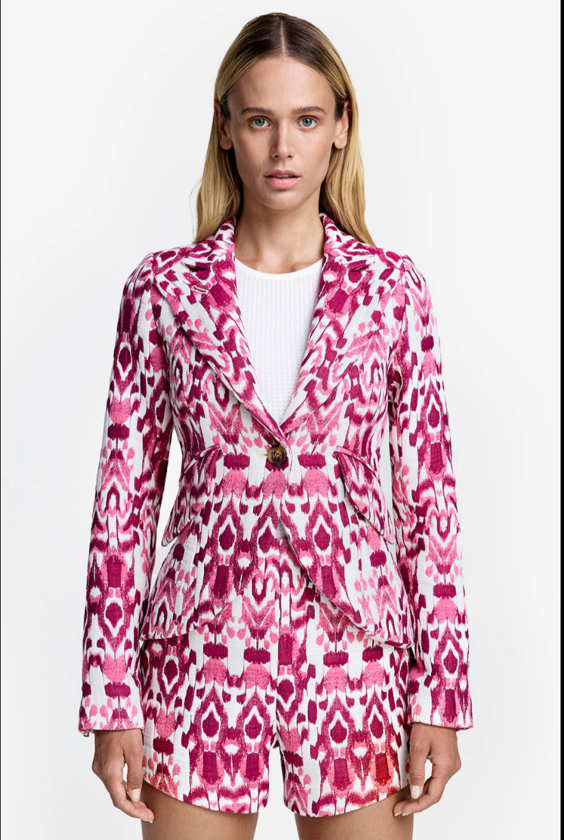Fitted blazer with one button closure by Smythe. Pair with Jaquard short sold separately for complete look.