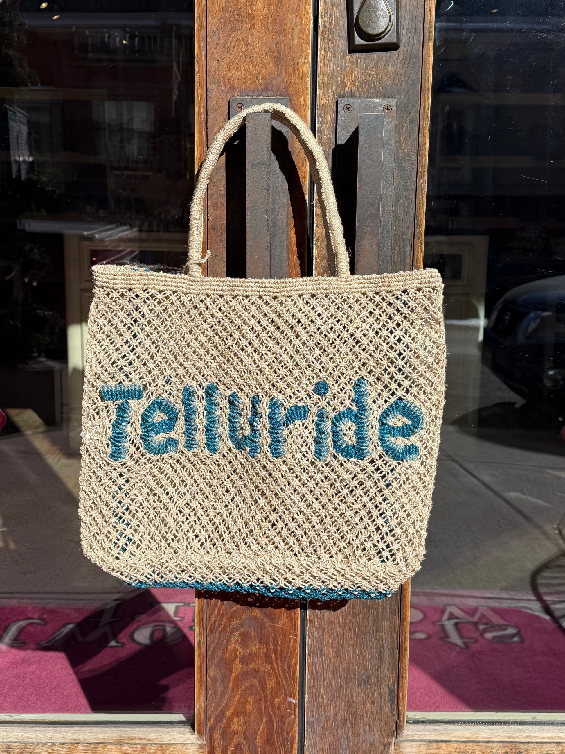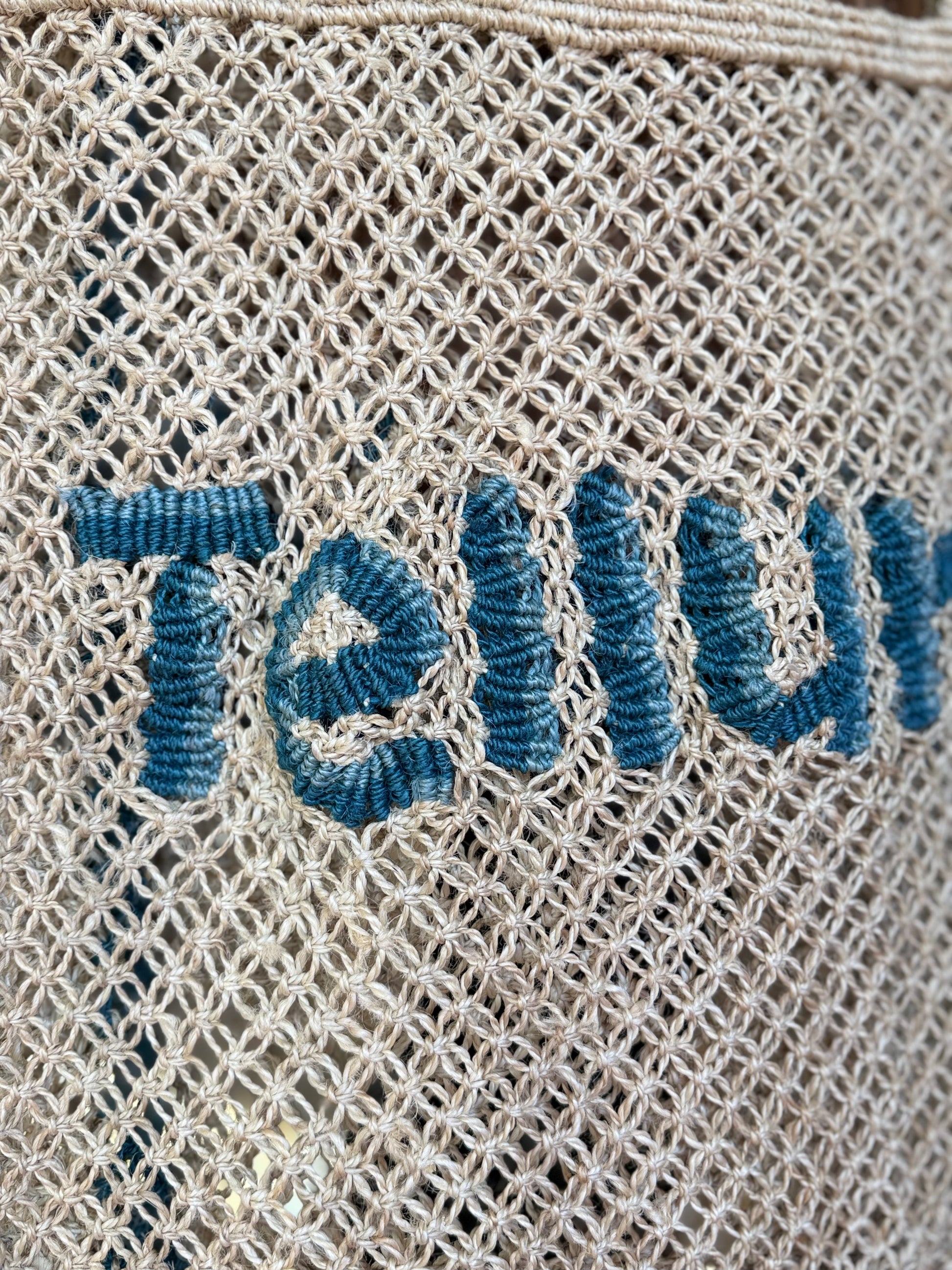 Jute bag handmade in Bangladesh. Custom made for Two Skirts. Natural jute colored bag, light blue and cerulean blue shadow font, blue stripe on bottom on bag.