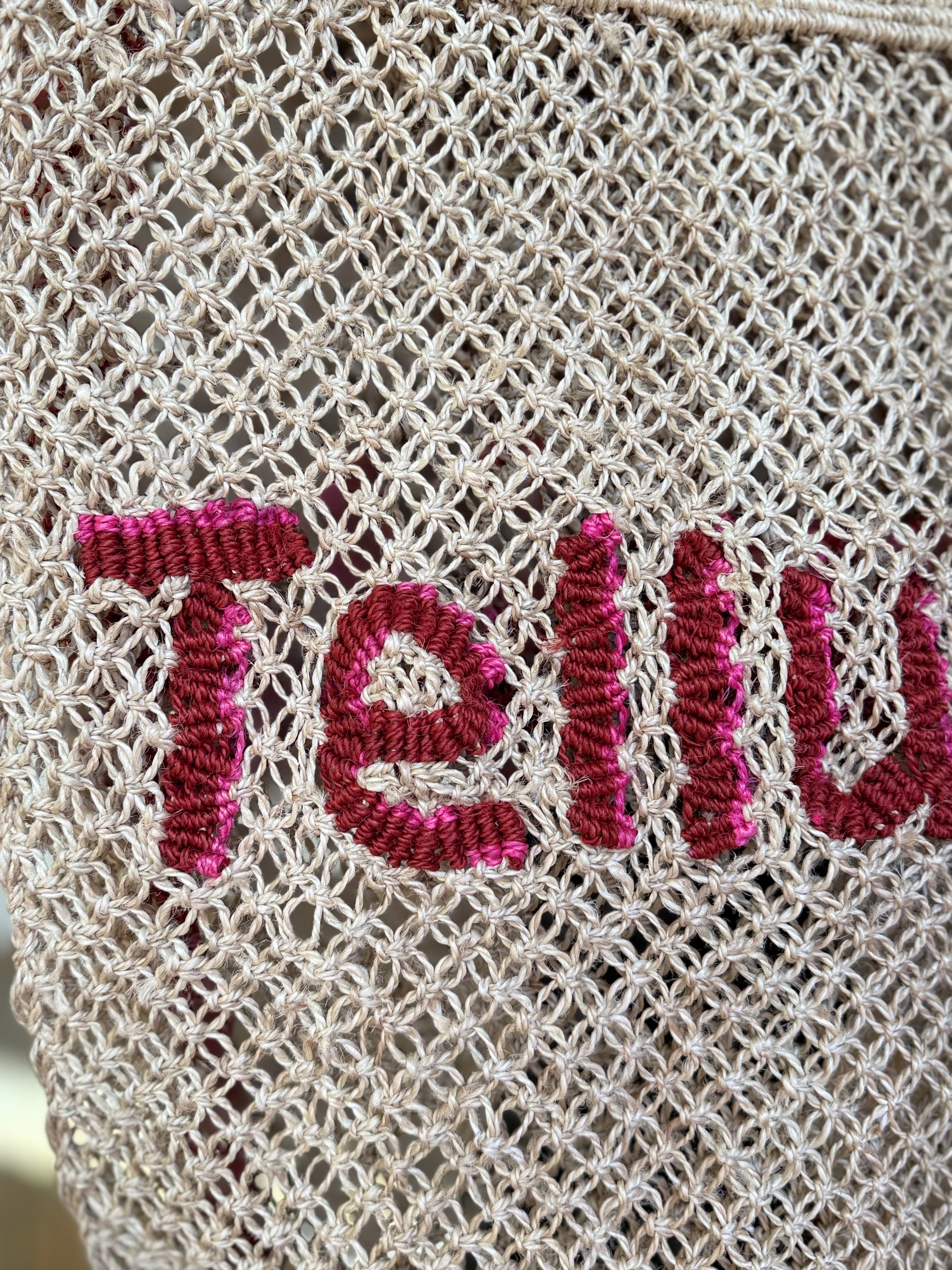 Jute bag handmade in Bangladesh. Custom made for Two Skirts. Natural jute colored bag, pink and red shadow font, red stripe on bottom on bag.