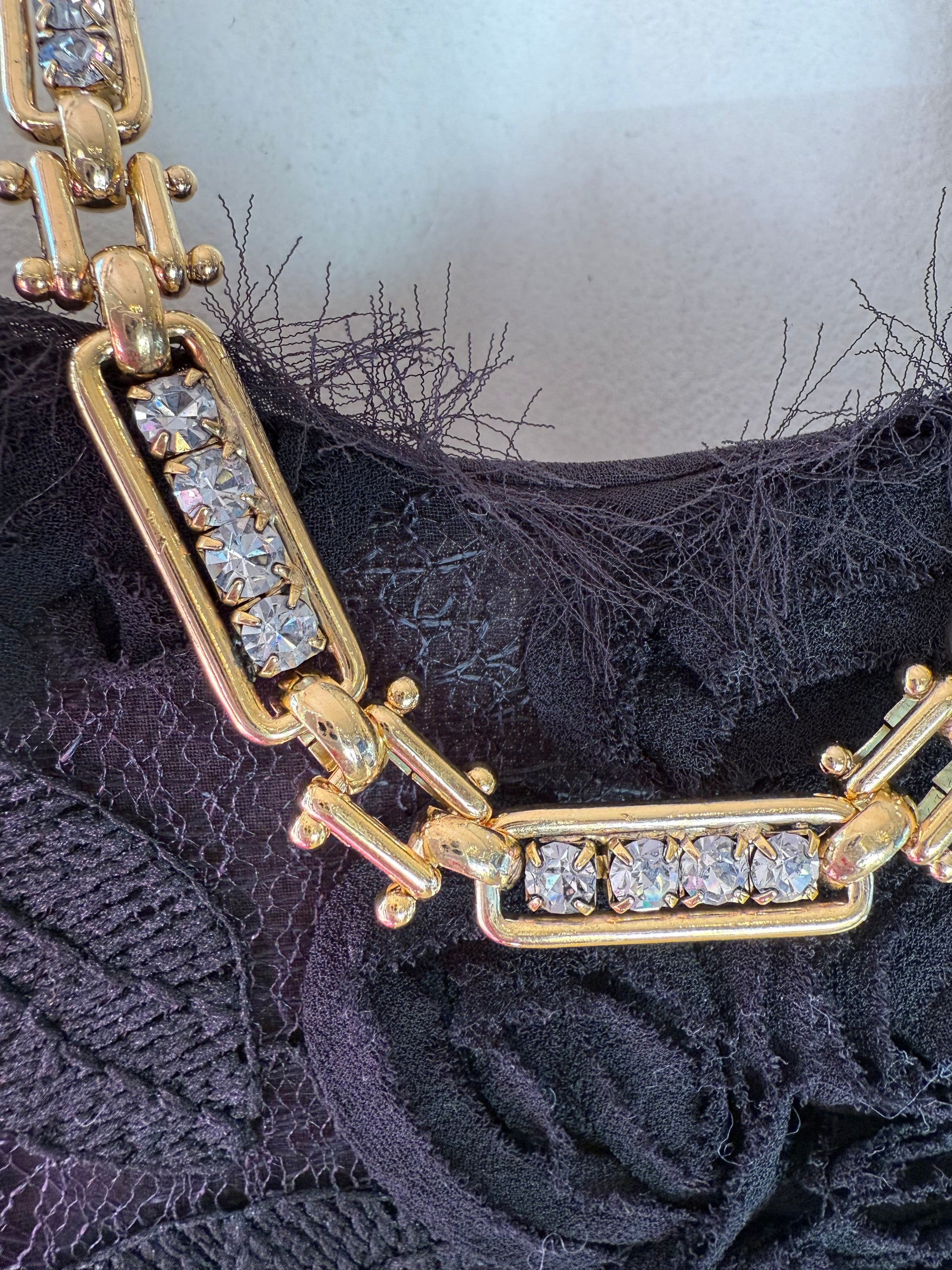 Antique gold plated brass necklace with clear crystals. No clasp, goes over head.