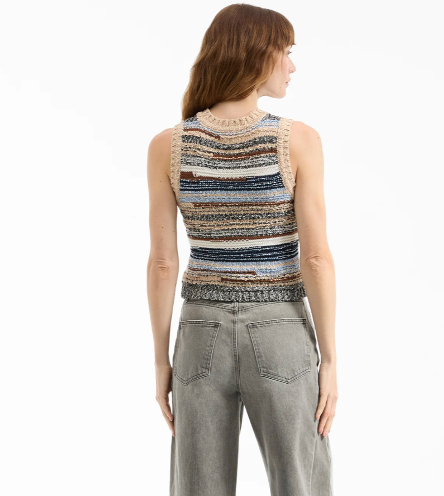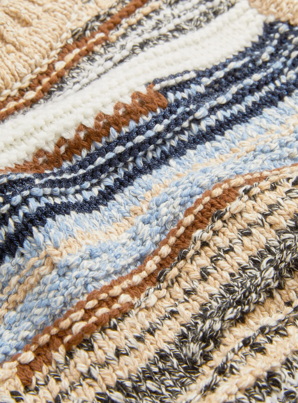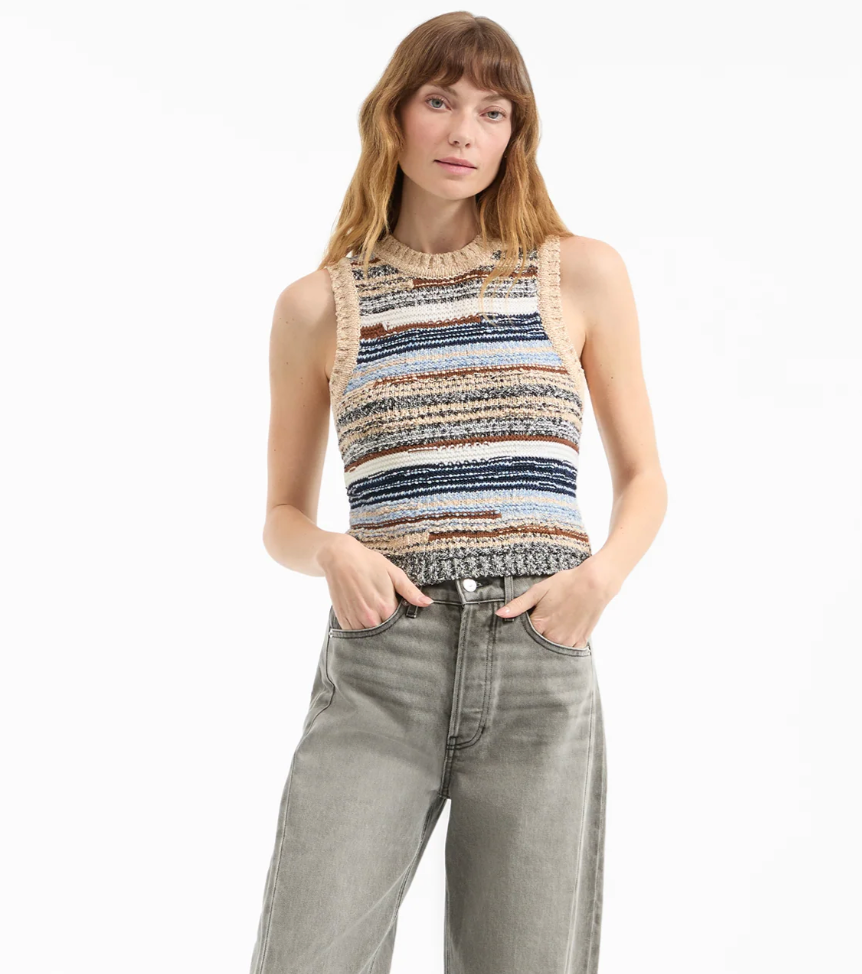Spun from a blend of premium cotton and wool, our cropped Jerrel top features an abstract striped pattern in blue and brown hues—striking yet neutral enough for effortless styling. Wide ribbed trimming at the crew neckline and hems complete the look.