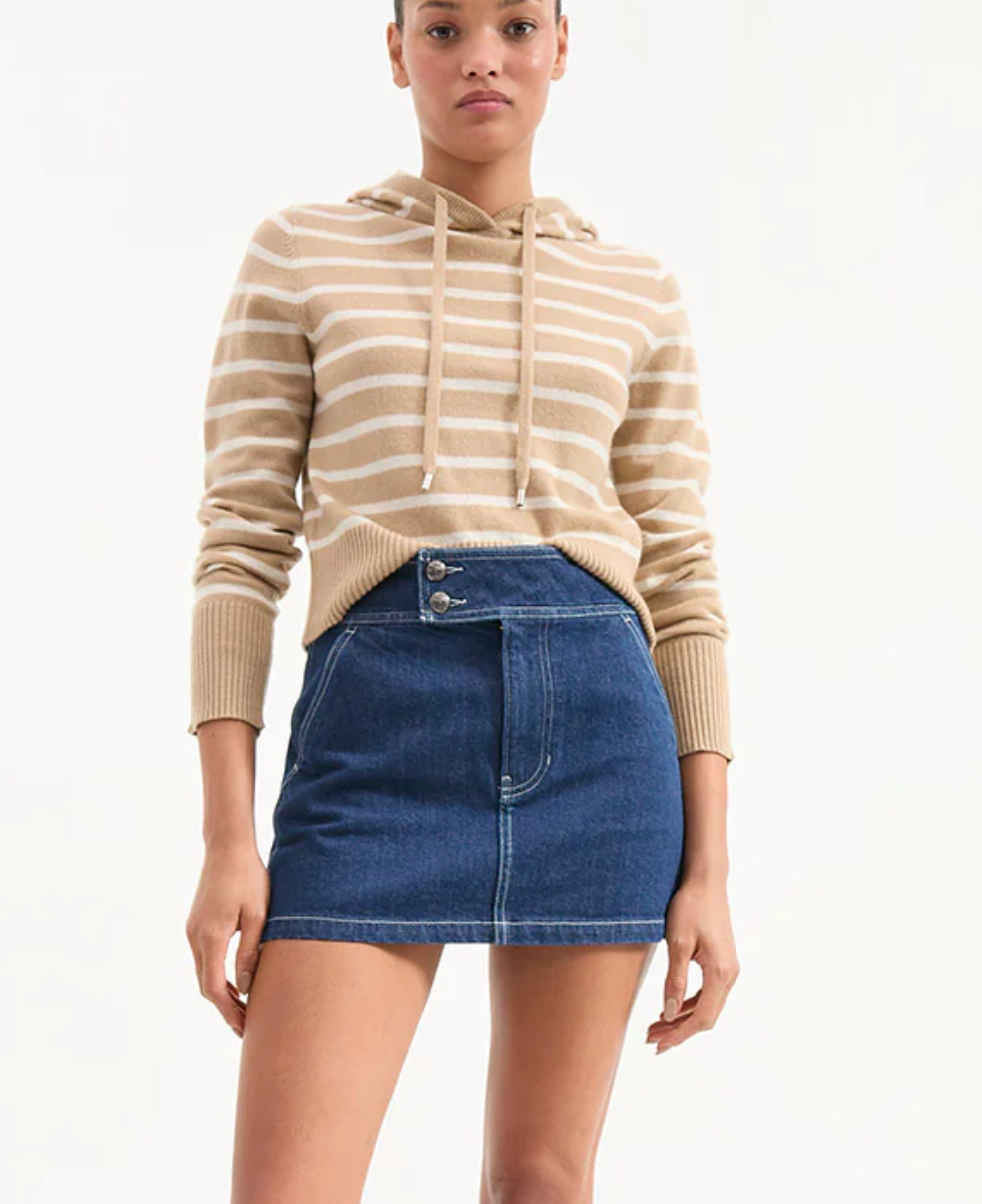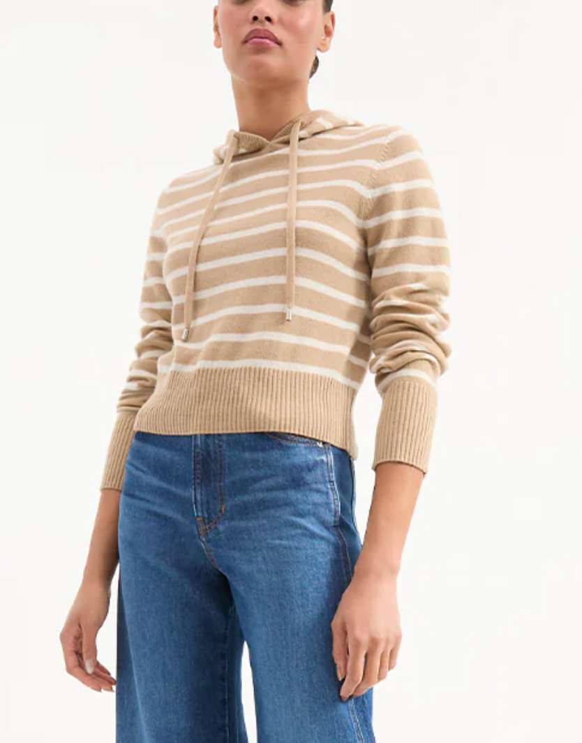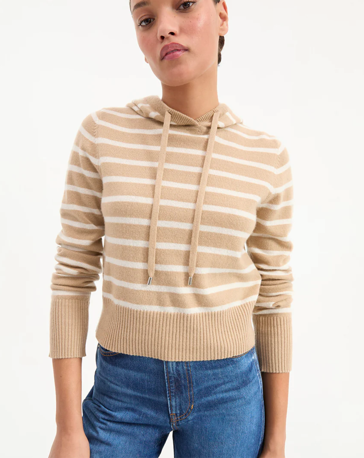 An essential, elevated. Spun from 100% cashmere, the Adrian hoodie boasts a relaxed fit, horizontal tan & white stripes and ribbed details.