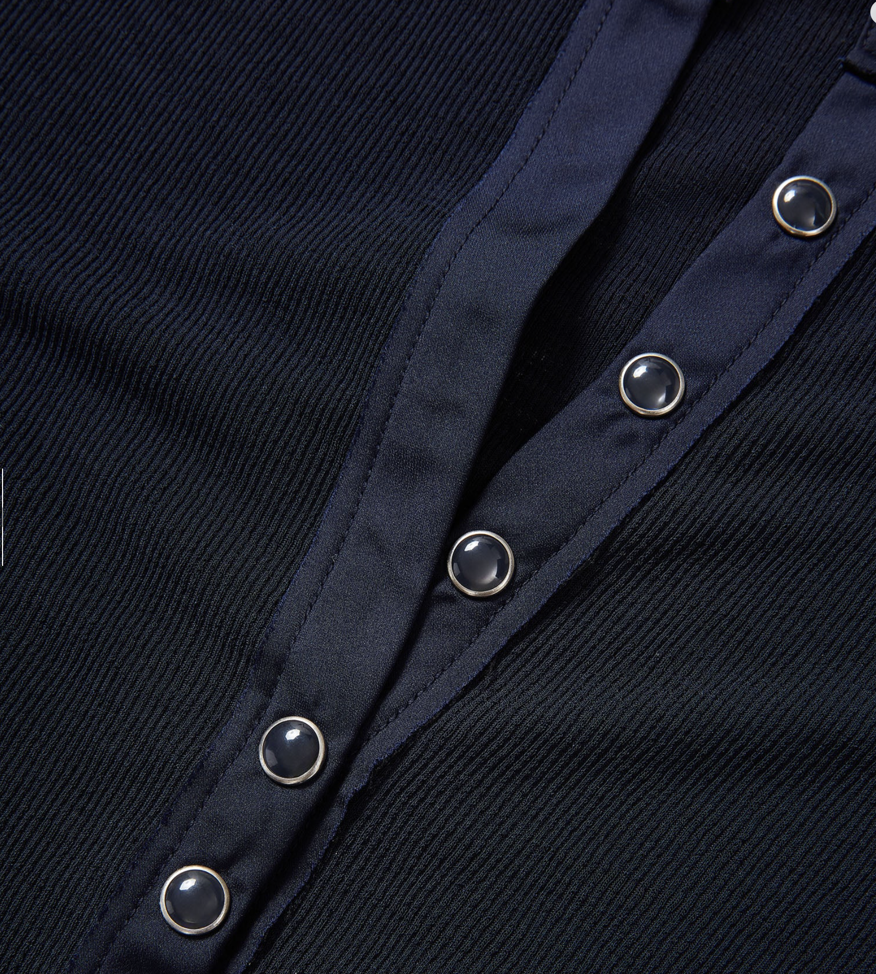A foundational piece you’ll reach for again and again. The Drexler henley shirt is crafted from a delicate, semi-sheer stretch rib knit that softly hugs the body for a slim, flattering fit. A satin-trimmed deep V-neckline and placket add subtle contrast and shine, finished with stone snaps for a modern touch.