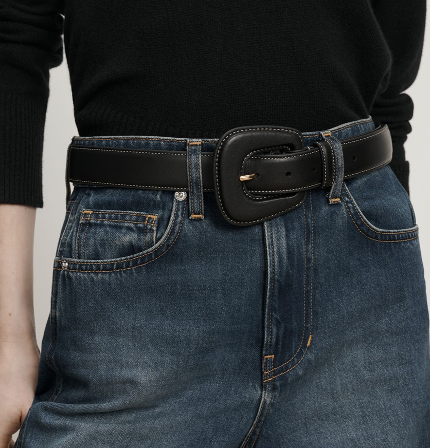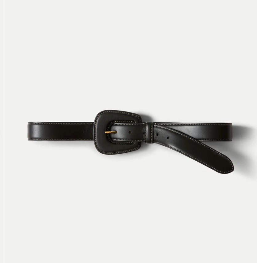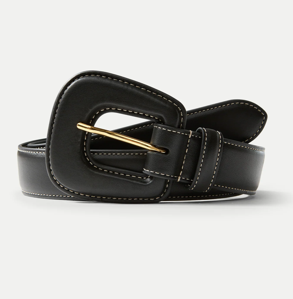 A modern take on the classic leather belt. Crafted from smooth, fine-grained leather and lined in soft nubuck, the Elsy features a sculptural, leather-covered buckle for a refined look. Contrast topstitching and a gold-toned prong adds understated detail. Style it with a tonal tailored trouser for a chic, minimalist look.