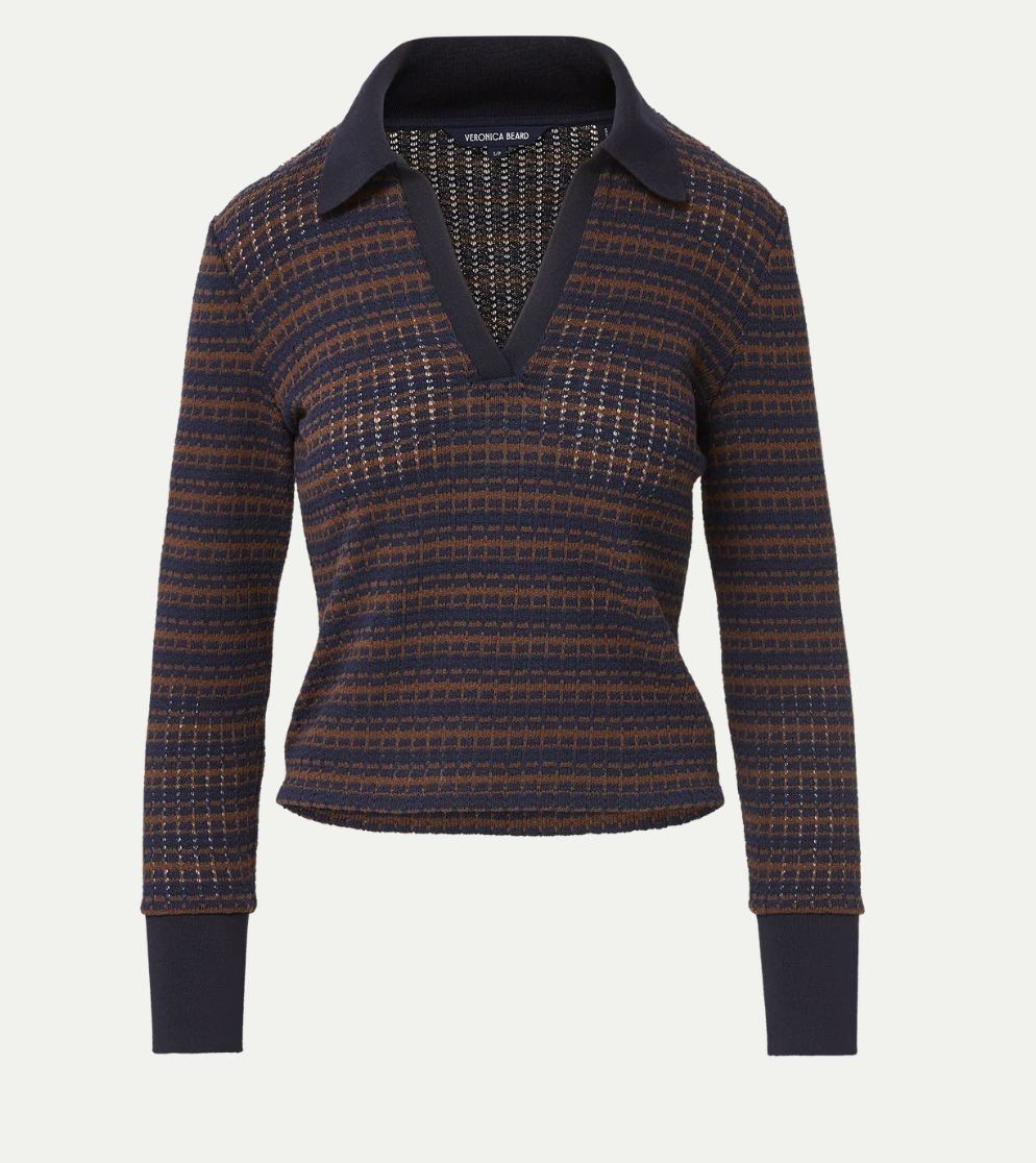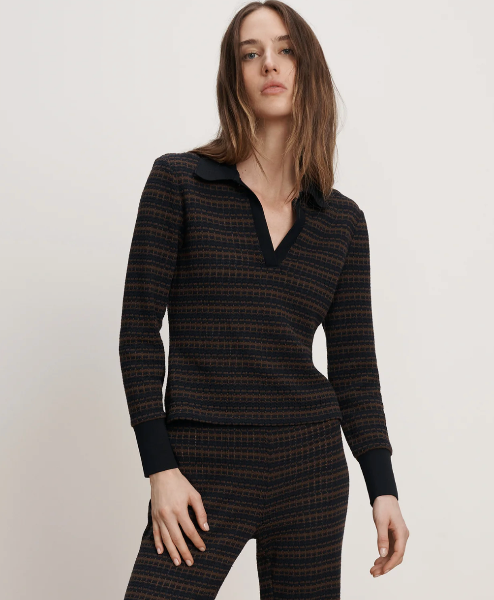 The polo, perfected. The Kamal is crafted from a rich navy-and-brown striped knit in a long-sleeved polo silhouette. Solid navy cuffs and a Johnny collar add dimension to this easy wardrobe staple. Pair with the coordinating Yadira pant sold separately for off-duty chic, or style with tailored trousers for polished ease.