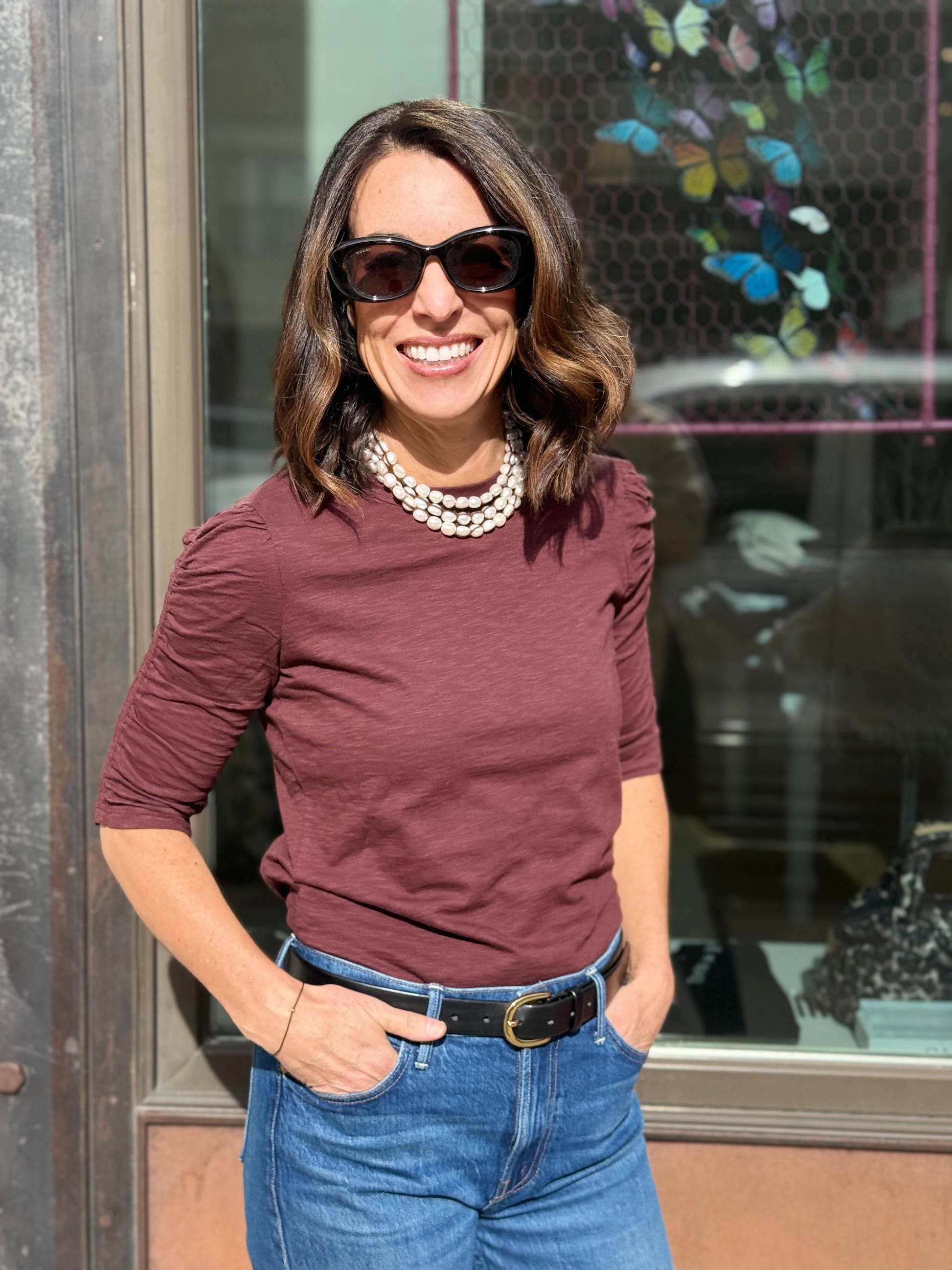 A feminine take on the everyday t-shirt. Made from 100% cotton for a soft, breathable feel, this essential tee is elevated with our signature ruching along the elbow-length sleeves.