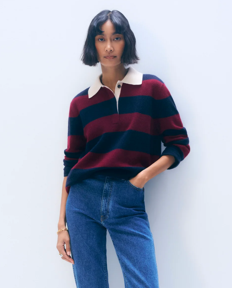 A modern take on the traditional rugby style, this long-sleeved sweater is knit from 100% cashmere in a 12-gauge jersey stitch. Its elongated, relaxed fit is elevated with bold, horizontal stripes and a ribbed collar for a polished, sporty feel.