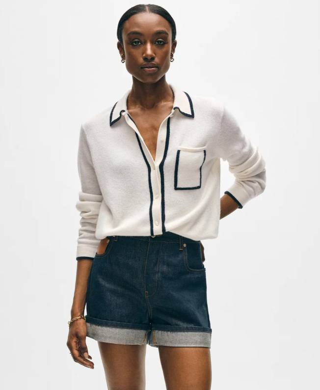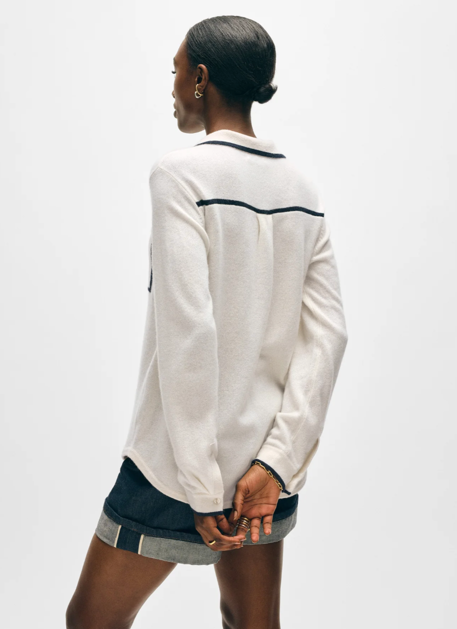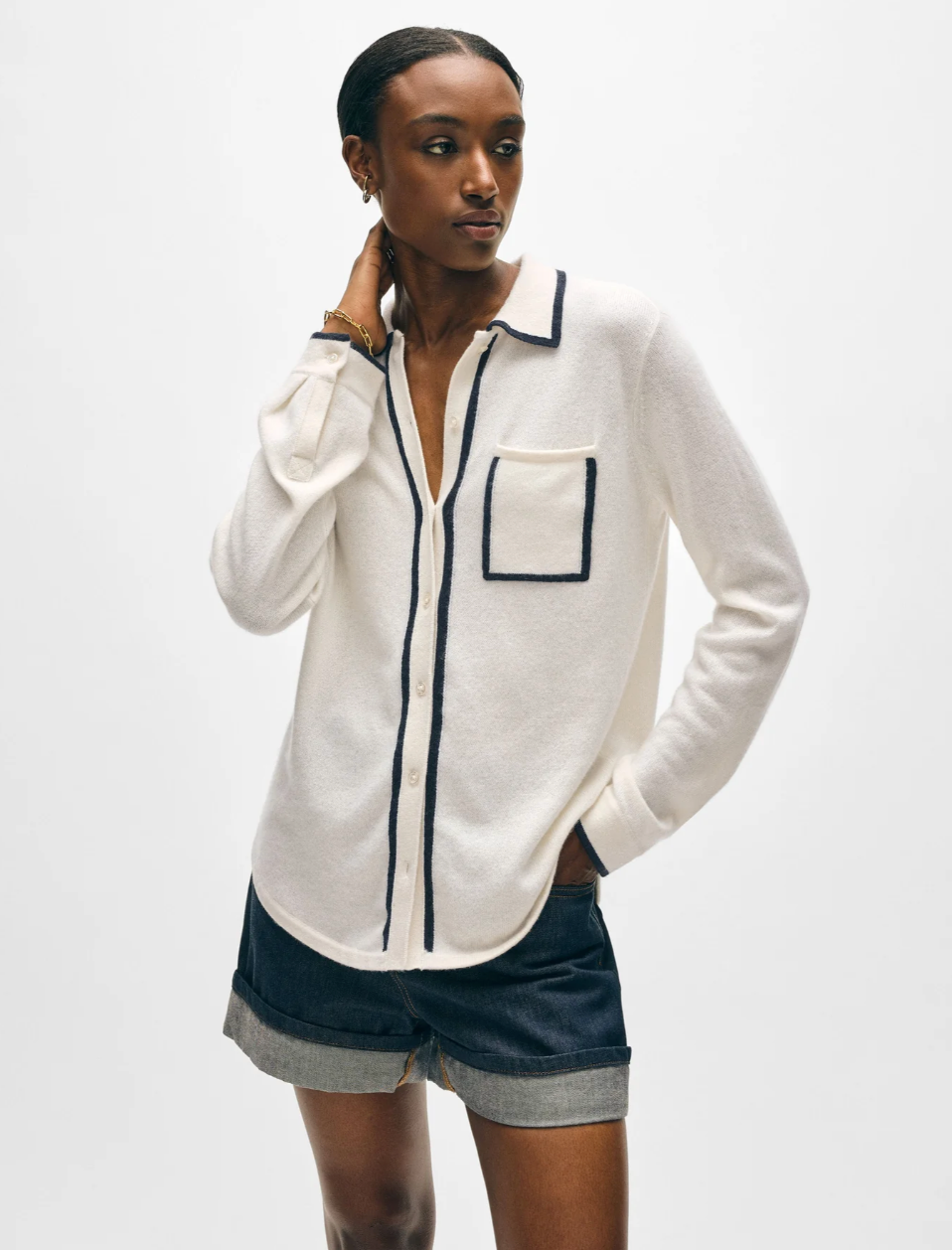 A tailored button-down shirt knit from 100% cashmere with a menswear-inspired appeal. Designed with contrast tipping along the collar, placket, and pocket for a clean, modern edge.