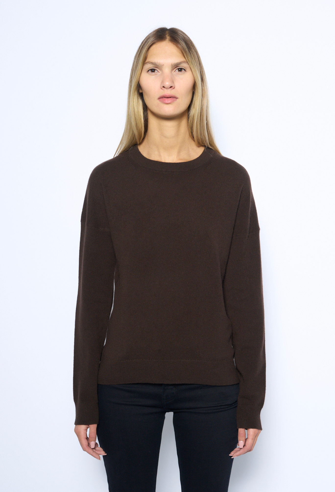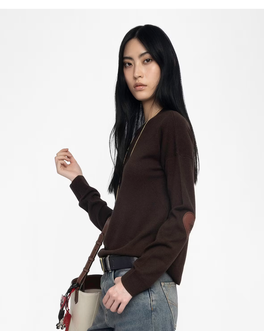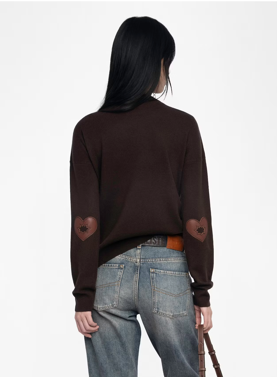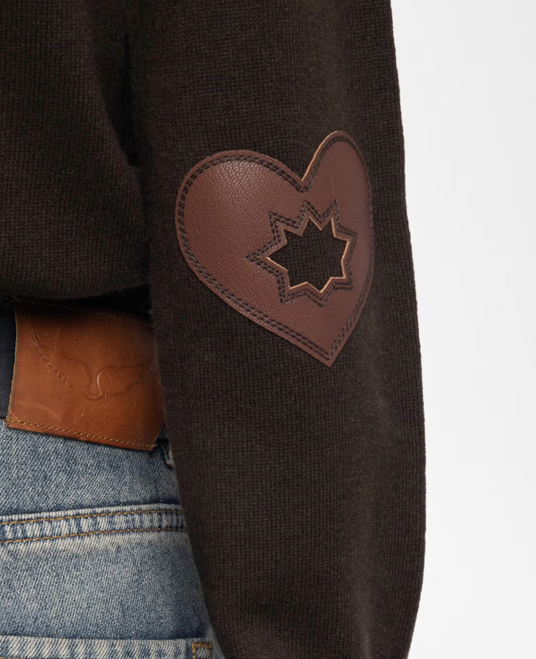 Cashmere/wool blend crewneck sweater with leather elbow heart/star patch by Zadig & Voltaire.