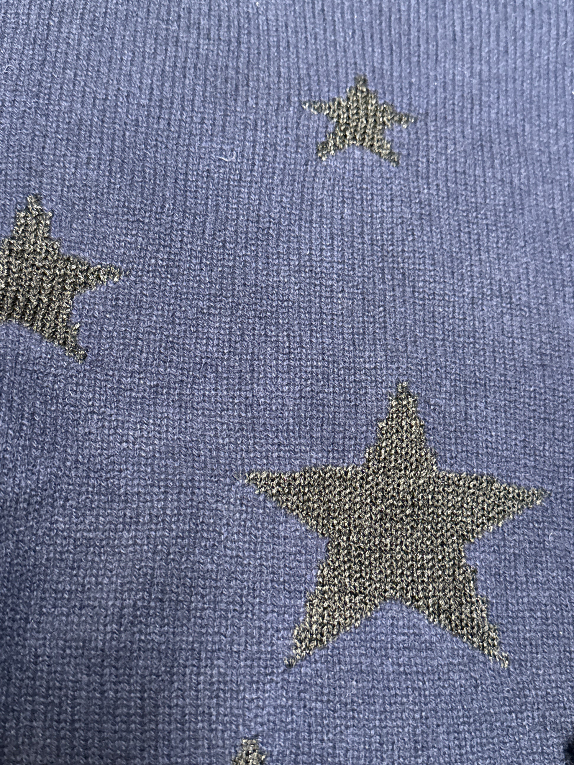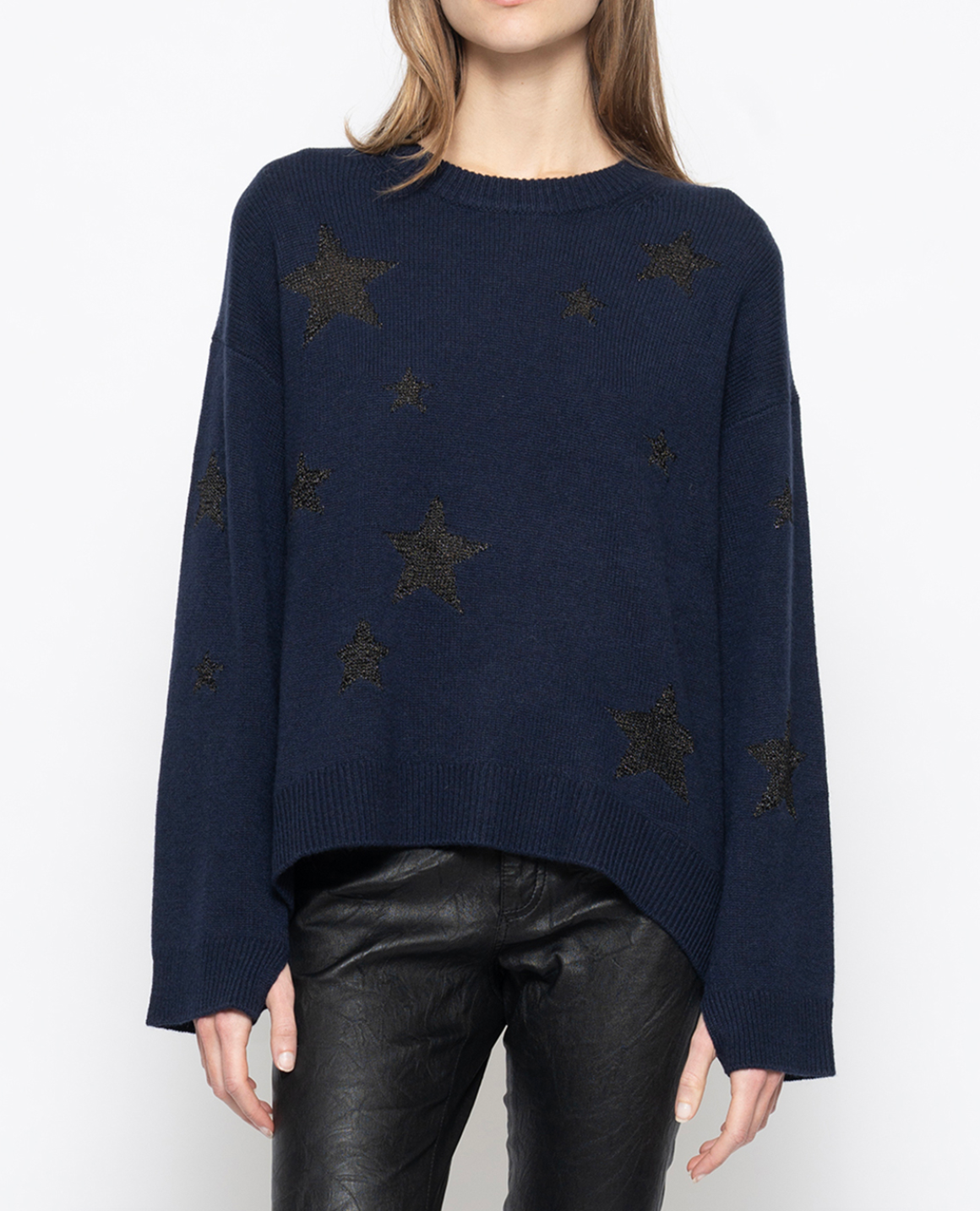 Navy blue cashmere long-sleeved jumper with decorative star motifs.
