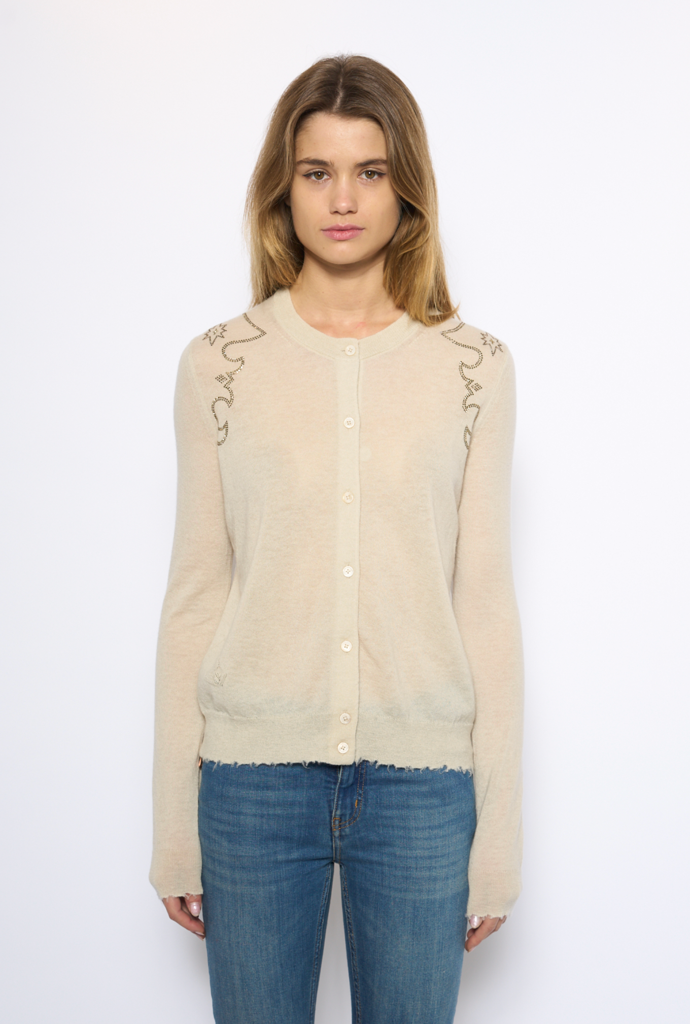 Raw edge cardigan with bedazzled shoulders by Zadig & Voltaire.