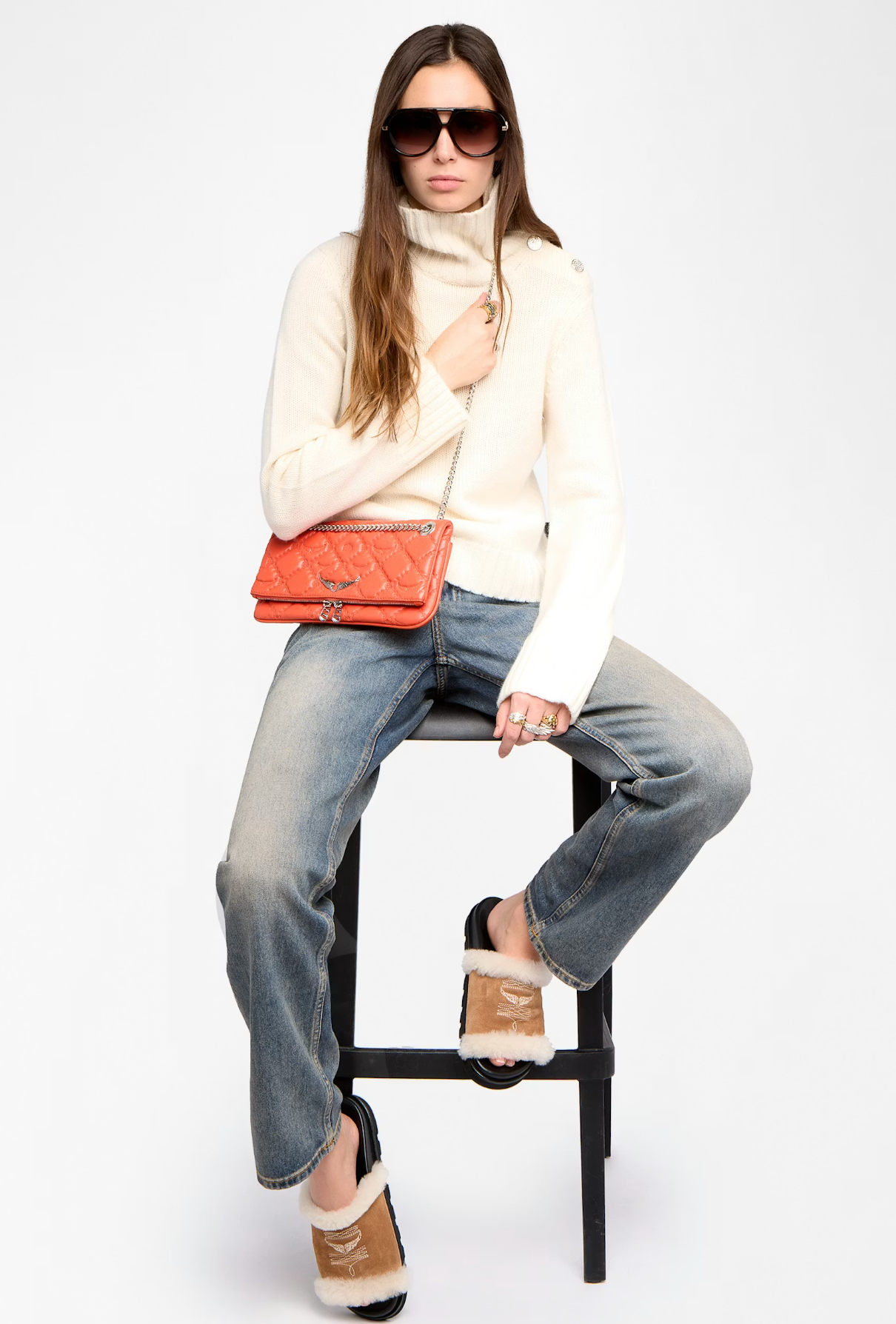 Clutch in smooth quilted leather with sliding metal chain and signature wings.