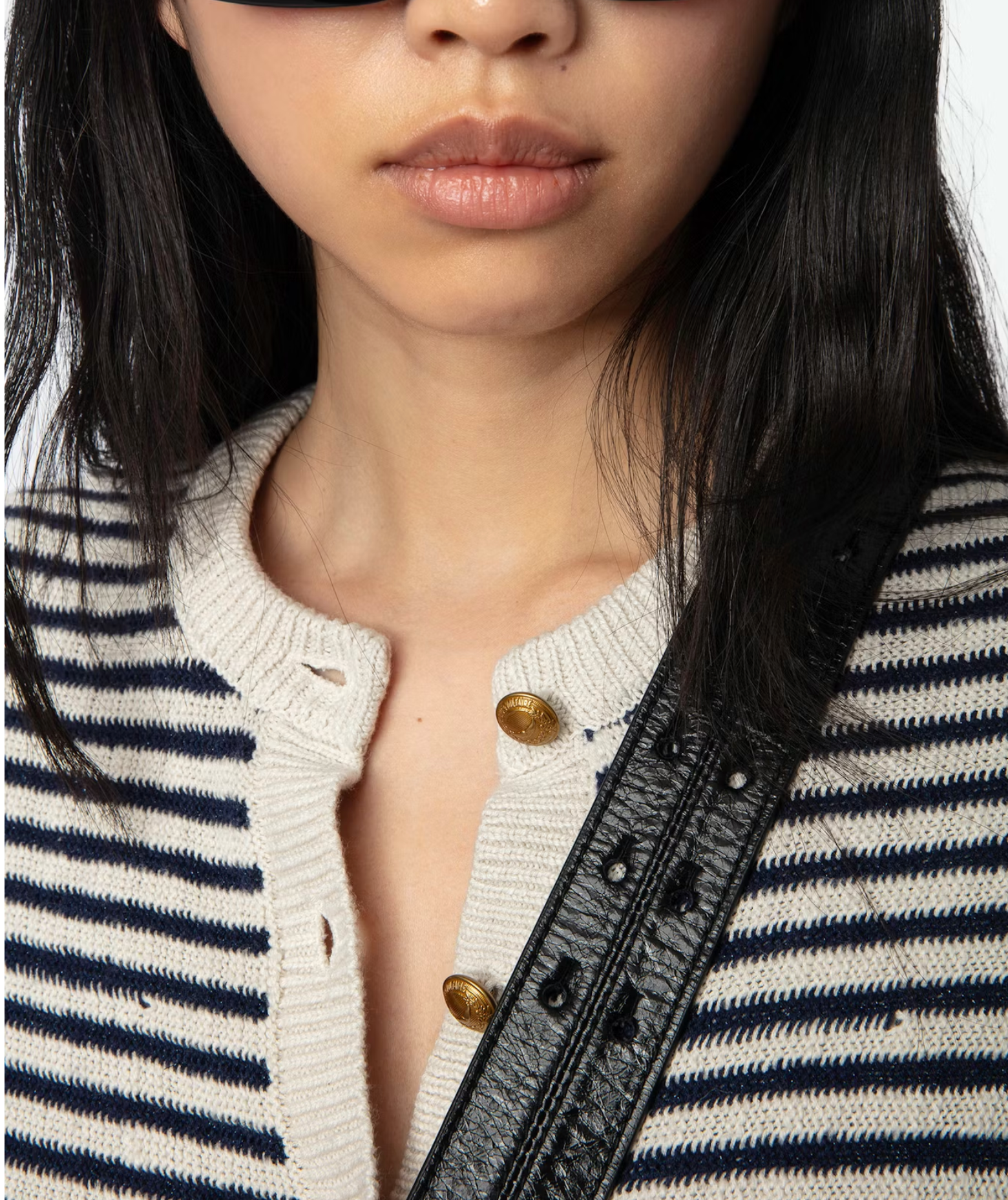A chic fusion of nautical inspiration and contemporary style. This short-sleeved sailor dress features a refined buttoned collar, exuding a timeless elegance that seamlessly aligns with the brand's modern aesthetic. Crafted in a deep encre striped print.